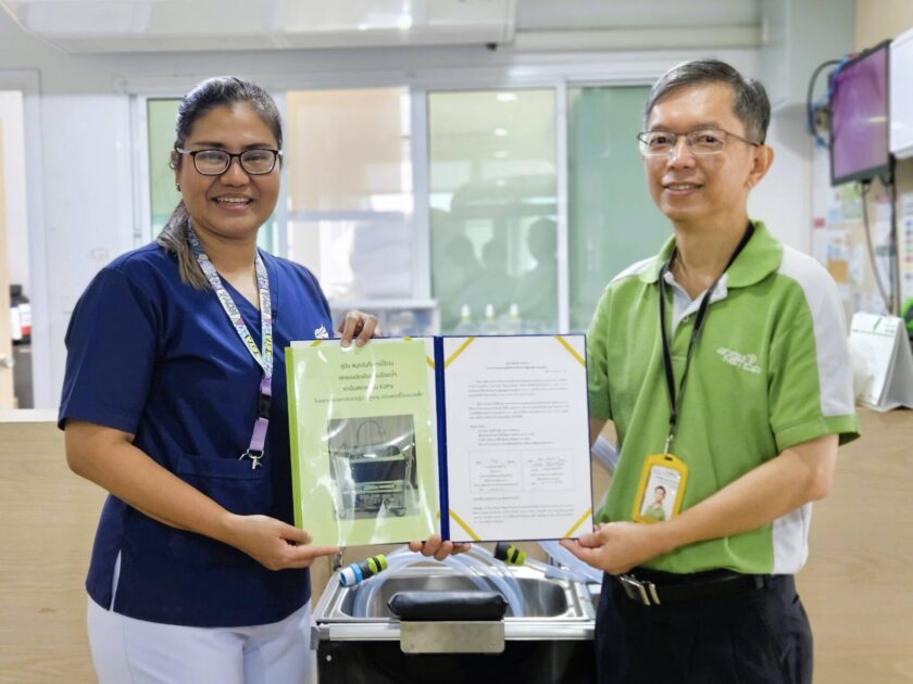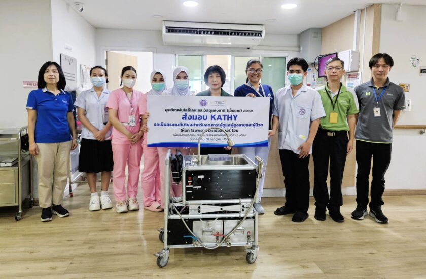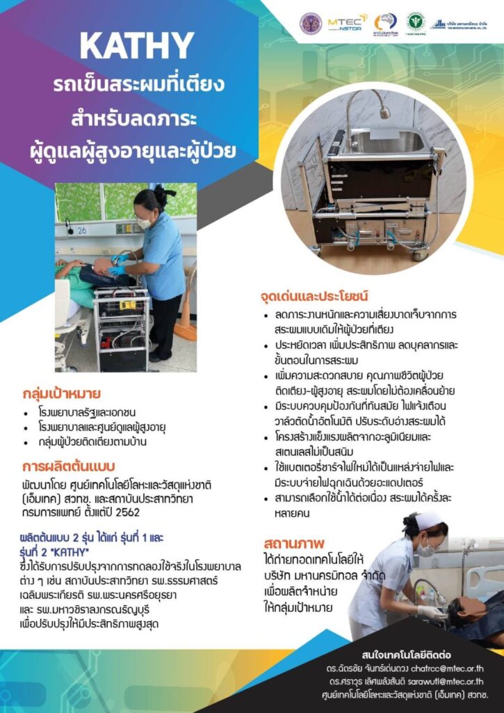 ศูนย์เทคโนโลยีโลหะและวัสดุแห่งชาติ (เอ็มเทค) สวทช. นำโดย ดร.ฉัตรชัย จันทร์เด่นดวง และ นายประสิทธิ์ วัฒนวงศ์สกุล และคณะ ส่งมอบ “KATHY รถเข็นสระผมที่เตียงสำหรับลดภาระผู้ดูแลผู้สูงอายุและผู้ป่วย” ผลงานวิจัยโดยทีมวิจัยการออกแบบเพื่อการเป็นอยู่ที่ดี เอ็มเทค สวทช. พร้อมแนะนำวิธีการใช้งานแก่เจ้าหน้าที่ของโรงพยาบาลที่เกี่ยวข้อง เพื่อทดลองใช้งานจริงและประเมินประสิทธิภาพของรถเข็นสระผมในสภาพแวดล้อมของโรงพยาบาลเฉพาะประเภทผู้ป่วยสูงอายุเฌ้อสเซอรี่ โฮม ขนาดเล็ก (Chersery Home International Hospital) เป็นระยะเวลา 6 เดือน โดยมี ผู้แทน ผู้อำนวยการโรงพยาบาล เป็นผู้รับมอบ
