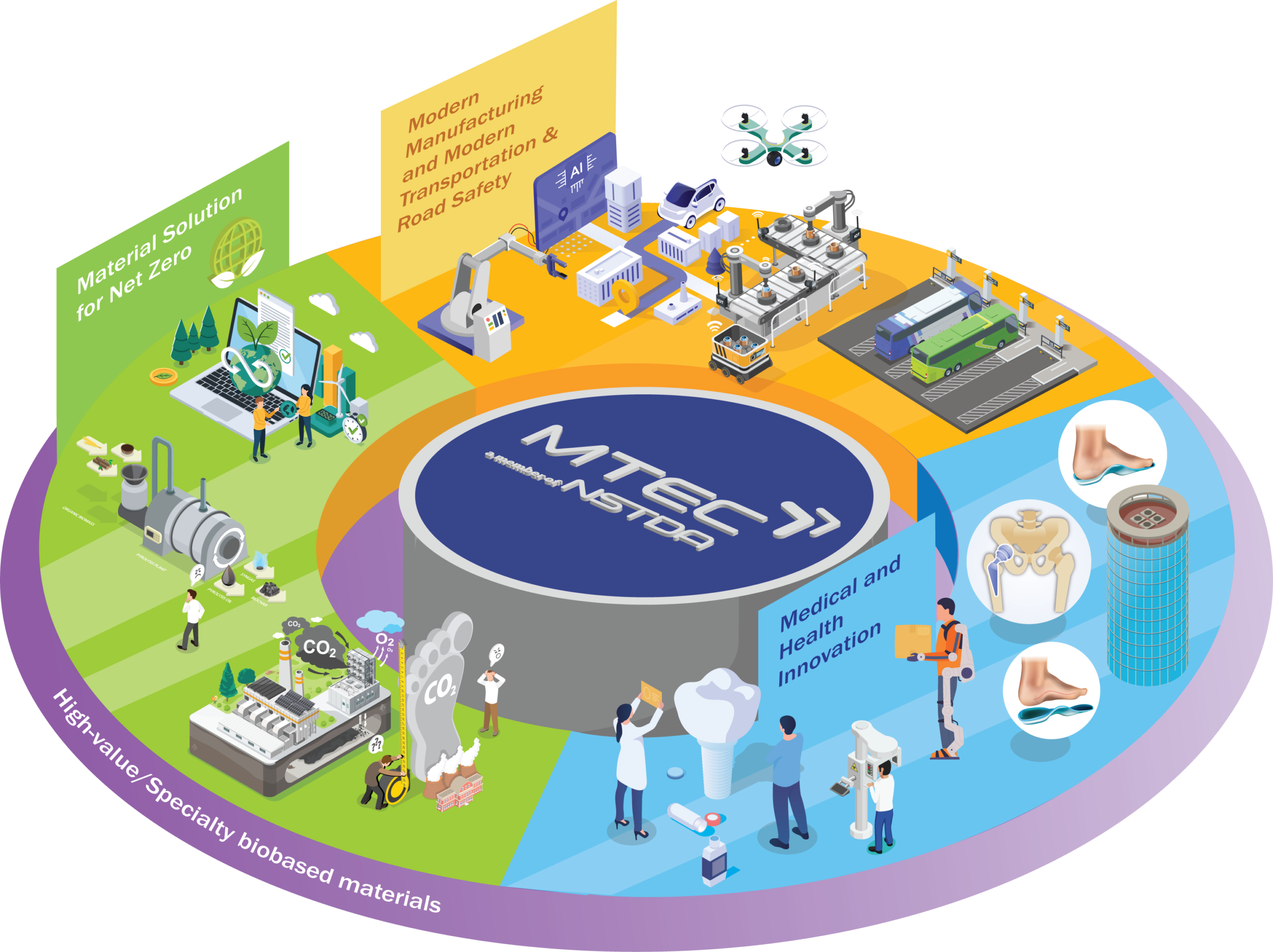 Our ServicesWhat We Offer MTEC Main research themes Driving Thailand towards Carbon Neutrality and Net-Zero Greenhouse Gas Emissions with Materials Technology Development of material technology and design to enhance manufacturing and transportation sectors Development of Innovative Materials/Medical and Health Devices to Enhance Quality of Life MTEC at a Glance 2025 Partners in Research Collaboration 0 Technology Transfer-Driven Business Development Projects 0 Intellectual Property-Implementation Projects 0 Public Interest Projects with Transfered Technology 0 Honors and Awards 0 Public EngagementMTEC News MTEC-NSTDA Hosted “MTEC Global Partnership Dialogue EP2” Academic Seminar on the Theme “Cross Cutting-Edge Strategic Theme” On January 27, 2026, the National Metal and Materials Technology Center (MTEC) hosted the MTEC Magik Growth” Durian Wrapping Bag Wins NRCT 2026 National Quality Achievement Award, Affirming the Success of a New Generation of Growers During the fruit development stage, durian growers face their ultimate “nightmare,” including attacks from fruit MTEC-NSTDA Integrates Partnerships to Promote Sustainable Construction Timber and Strengthen the Competitiveness of Thailand’s Wood Industry On December 16, 2026, at the MTEC Building, Thailand Science Park, Pathum Thani Province, the Load More