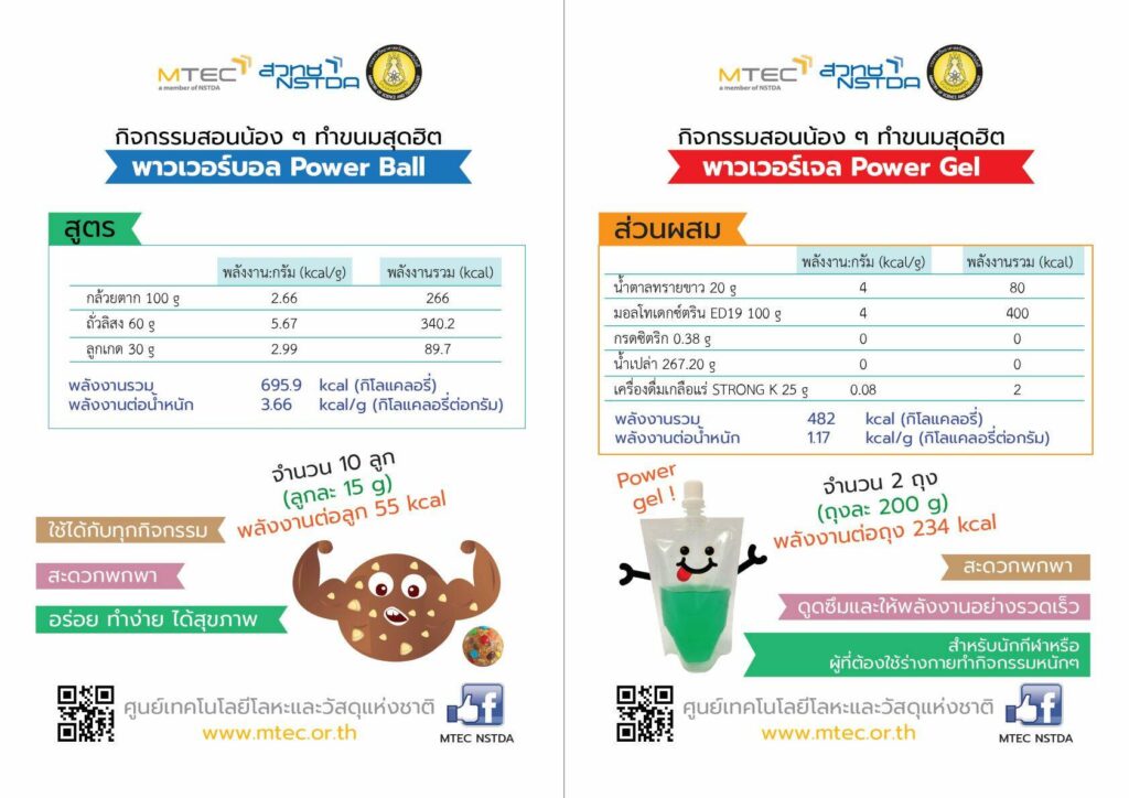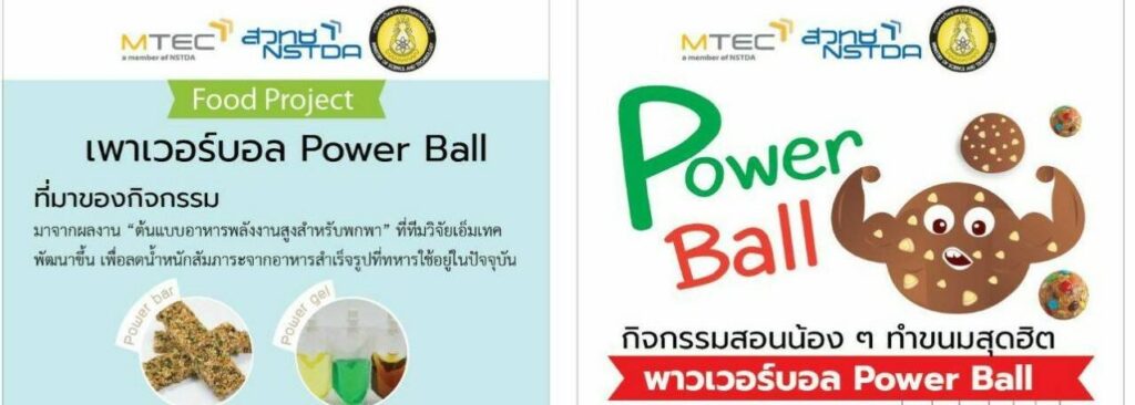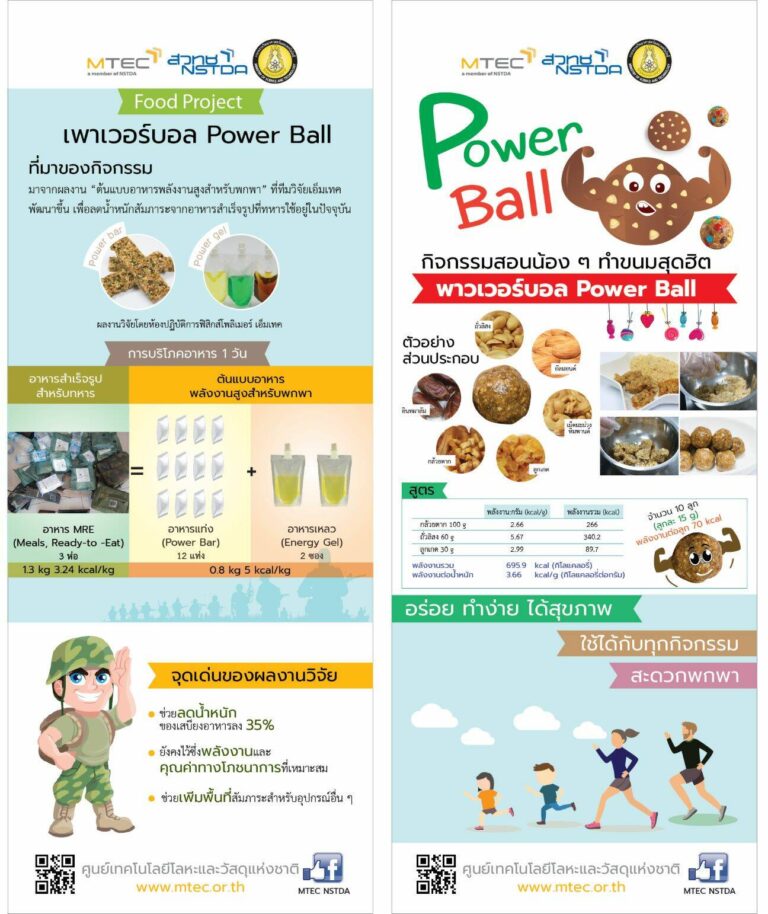 ทีมวิจัยวัสดุศาสตร์อาหาร เอ็มเทค สวทช. พัฒนา “ต้นแบบอาหารพลังงานสูงสำหรับพกพา” เพื่อลดน้ำหนักของเสบียงอาหารของกำลังพลทหารที่ปฏิบัติภารกิจพิเศษหรือเดินทางไกลที่เดิมเป็นอาหารสำเร็จรูป (Meals, Ready-to-Eat, MRE) โดยน้ำหนักลดลงกว่า 30% หรือคิดเป็น 3.2 กิโลกรัมต่อสัมภาระอาหารใน 1 สัปดาห์ ทำให้มีน้ำหนักเหลือเพื่อพกพาอุปกรณ์อื่นๆ เพิ่มขึ้น