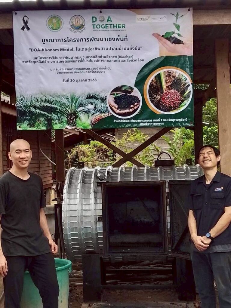 กระทรวงการอุดมศึกษา วิทยาศาสตร์ วิจัยและนวัตกรรม (อว.) โดยศูนย์เทคโนโลยีโลหะและวัสดุแห่งชาติ (เอ็มเทค) และศูนย์เทคโนโลยีอิเล็กทรอนิกส์และคอมพิวเตอร์แห่งชาติ (เนคเทค) สำนักงานพัฒนาวิทยาศาสตร์และเทคโนโลยีแห่งชาติ (สวทช.) ดำเนินการติดตั้งและทดสอบระบบ Biochar-dMRV สำหรับการตรวจวัด บันทึก และติดตามข้อมูลการผลิตไบโอชาร์ในระดับชุมชน ให้กับโครงการวิจัยและพัฒนากระบวนการผลิตถ่านชีวภาพ (Biochar) จากวัสดุเหลือใช้ทางการเกษตรเพื่อการใช้ประโยชน์ทางการเกษตรและสิ่งแวดล้อม ภายใต้การดูแลของ นายสราวุฒิ ปานทน ผู้อำนวยการศูนย์วิจัยเกษตรวิศวกรรมสุราษฎร์ธานี กรมวิชาการเกษตร ณ กลุ่มส่งเสริมอาชีพเกษตรกรสวนปาล์มน้ำมัน อำเภอขนอม จังหวัดนครศรีธรรมราช ระหว่างวันที่ 15–17 ธันวาคม 2568