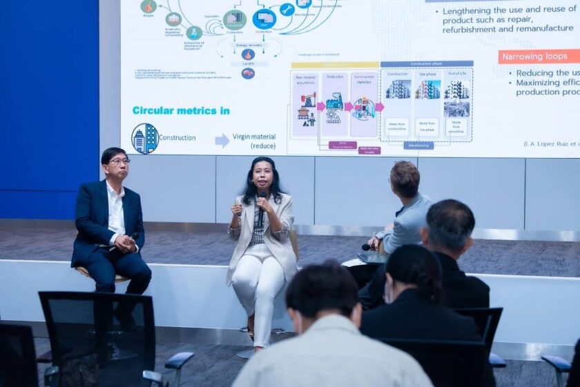 นายวิชัย รายรัตน์ Sustainable Development Director บริษัท เอสซีจี ซิเมนต์-ผลิตภัณฑ์ก่อสร้าง จำกัด ได้แบ่งปันประสบการณ์ในการนำดัชนี MCI มาประยุกต์ใช้ในกระบวนการผลิตของบริษัท ว่า “SCG ให้ความสำคัญกับการพัฒนาผลิตภัณฑ์ที่เป็นมิตรต่อสิ่งแวดล้อมในทุกๆด้าน ทั้งการปรับปรุงกระบวนการผลิตเพื่อลดการปล่อยก๊าซคาร์บอนไดออกไซด์ การนำพลังงานหมุนเวียนมาใช้ทดแทนถ่านหินและก๊าซธรรมชาติ การลดการใช้ทรัพยากรน้ำ และรวมถึงการลดการใช้ทรัพยากรธรรมชาติที่ใช้แล้วหมดไป (Nonrenewable resources) โดยนำวัสดุหมุนเวียนมาใช้ทดแทน ตามแนวคิดเศรษฐกิจหมุนเวียนที่ เอสซีจีใช้เป็นตัวขับเคลื่อนหลักควบคู่กับการมุ่งไปสู่ Net Zero การขับเคลื่อนเศรษฐกิจหมุนเวียน เอสซีจีได้มีการตั้งเป้าหมายให้แต่ละธุรกิจต้องมีการนำวัสดุทดแทนมาใช้ โดยตั้งเป้าหมายในปี 2030 ให้มีการนำวัสดุหมุนเวียนมาใช้ทดแทนวัตถุดิบธรรมชาติให้ได้ 10% ซึ่งในปี 2023 เอสซีจีสามารถใช้วัสดุหมุนเวียนได้ 6.64% ซึ่งแนวทางสำคัญคือการนำวัสดุที่เป็นของเสียที่ไม่เป็นอันตรายทั้งจากภายในและภายนอกเอสซีจีหรือสินค้าที่หมดอายุการใช้งาน กลับมาใช้เป็นวัตถุดิบทดแทน ในสัดส่วนที่สินค้ายังได้คุณภาพและเป็นไปตามมาตรฐาน นอกจากนี้ยังพัฒนาวิจัยที่จะนำวัสดุธรรมชาติที่สามารถทดแทนใหม่ได้ (Renewable resources) มาทดแทนเพิ่มเติมอีกด้วย โดยใช้ดัชนี MCI มาเป็นเครื่องมือในการประเมินประสิทธิผลของการหมุนเวียนวัสดุทดแทนของสินค้าแต่ละประเภท เพื่อให้ได้ผลิตภัณฑ์ที่มีค่า MCI สูงขึ้น ตัวอย่างเช่น ปูนเอสซีจี คาร์บอนต่ำ มีการนำเถ้าลอย (Fly ash) มาทดแทนหินปูน และใช้ยิบซั่มสังเคราะห์มาทดแทนแร่ยิบซั่มธรรมชาติ”
