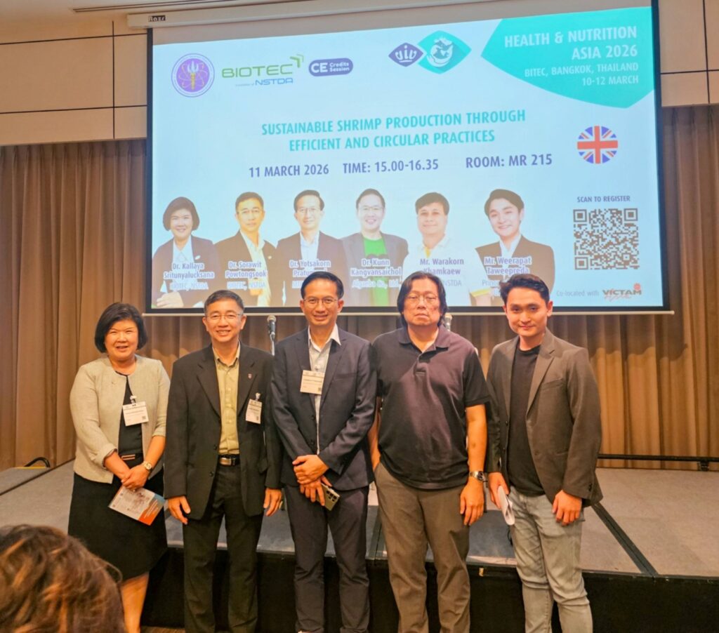 ศูนย์เทคโนโลยีโลหะและวัสดุแห่งชาติ สวทช. โดย ดร.ยศกร ประทุมวัลย์ (Senior Engineer และหัวหน้าทีมวิจัย) ทีมวิจัยคอมพิวเตอร์ช่วยในการคำนวณทางวิศวกรรม (CAE Research Team) ได้บรรยายหัวข้อ “Implementation of RAS Technology for Aquaculture Industry in Thailand” ภายใต้ Session “Sustainable Shrimp Production Through Efficient and Circular Practices” ในงาน Health & Nutrition Asia 2026 ซึ่งงานแสดงสินค้าและสัมมนาชั้นนำสำหรับธุรกิจ สุขภาพและโภชนาการสัตว์ในเอเชีย ที่จัดขึ้นระหว่างวันที่ 10–12 มีนาคม 2569 ณ ศูนย์นิทรรศการและการประชุมไบเทค กรุงเทพมหานคร https://healthandnutrition.viv.net/visit/conference-program