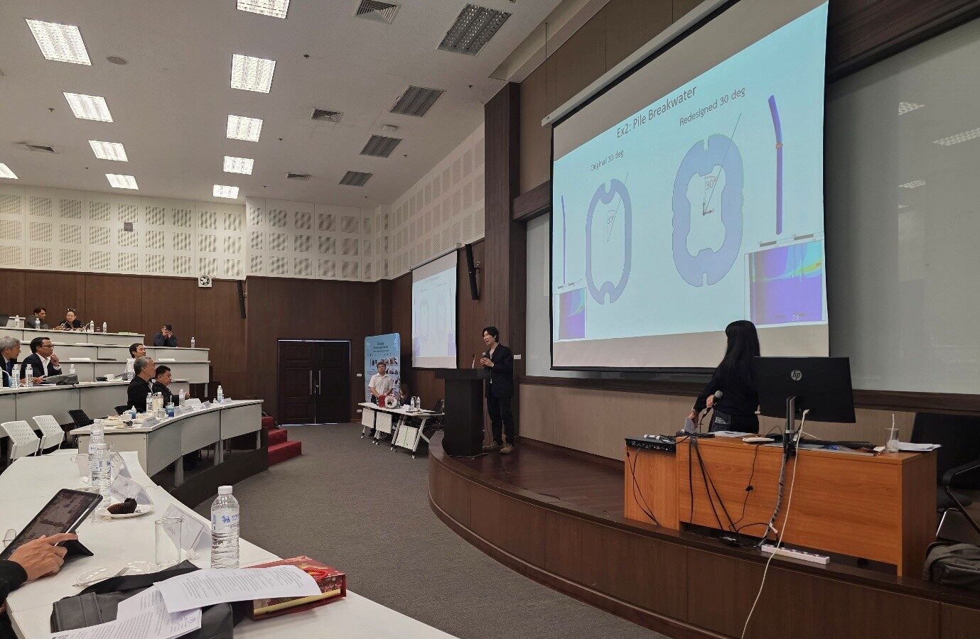 ดร.สมบูรณ์ โอตรวรรณะ บรรยายเรื่อง “บทบาทของการออกแบบและคำนวณเชิงวิศวกรรมในการวิจัยและพัฒนานวัตกรรมการป้องกันชายฝั่ง” ซึ่งเป็นการนำเสนอผลงานที่ผ่านมาและขีดความสามารถของเอ็มเทคในการประยุกต์ใช้เทคโนโลยีคอมพิวเตอร์ช่วยในการคำนวณทางวิศวกรรม (Computer-Aided Engineering: CAE) และองค์ความรู้ด้านวิศวกรรมเครื่องกลและวิศวกรรมวัสดุเพื่อออกแบบผลิตภัณฑ์นวัตกรรมเพื่อบรรเทาปัญหาการกัดเซาะชายฝั่ง (coastal erosion) ส่วนนายพงศ์ภัทร ทองมาก ได้นำเสนอบทบาทและบริการของโปรแกรมสนับสนุนการพัฒนาเทคโนโลยีและนวัตกรรม (Innovation Technology Assistance Program: ITAP) ในการช่วยสนับสนุนโครงการด้านการวิจัยและพัฒนานวัตกรรมต่าง ๆ