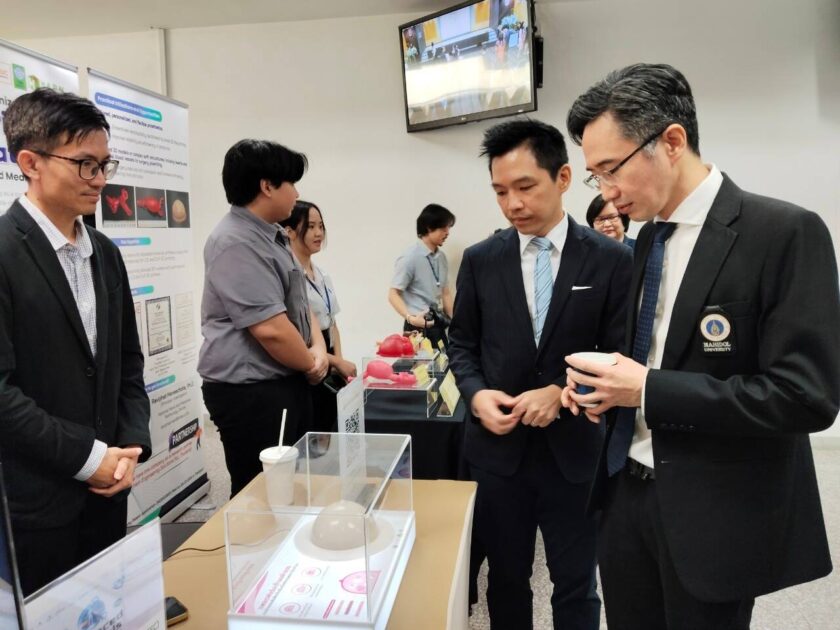 ภายในงาน รองศาสตราจารย์ ดร.เติมศักดิ์ ศรีคิรินทร์ ผู้อํานวยการศูนย์เทคโนโลยีโลหะและวัสดุแห่งชาติ (MTEC) ได้ร่วมบรรยายในหัวข้อ “Future Trends in Advanced Materials Technology and Innovation” เน้นย้ำถึงแนวโน้มและความสำคัญของเทคโนโลยีวัสดุขั้นสูงในอนาคต พร้อมทั้งนำทีมนักวิจัยจากเอ็มเทค จัดแสดงนิทรรศการนำเสนอผลงานวิจัยสำคัญ ได้แก่ 1) Ultrasound phantom จากวัสดุ bio-based material (เช่น มันสำปะหลัง) โดย ดร.บริพัตร เมธาจารย์ และ 2) Customized 3D printed soft materials for advanced medical uses โดย ดร.รวิภัทร มณีโชติ นักวิจัย กลุ่มวิจัยการออกแบบเชิงวิศวกรรมและการคำนวณ เอ็มเทค อีกทั้งยังมีกิจกรรม Executive Talk และ Innovation Talk ซึ่งเป็นเวทีสำหรับการแลกเปลี่ยนวิสัยทัศน์ด้านนวัตกรรมและเทคโนโลยีวัสดุทางการแพทย์ขั้นสูง โดยได้รับเกียรติจากผู้บริหารและผู้เชี่ยวชาญชั้นนำในอุตสาหกรรมมาร่วมแบ่งปันแนวคิดและประสบการณ์ โดยมีหัวข้อสัมมนาที่น่าสนใจตลอดทั้งวัน