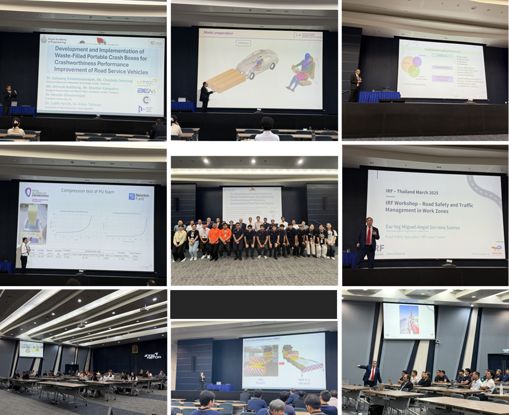 สำนักงานพัฒนาวิทยาศาสตร์และเทคโนโลยีแห่งชาติ สวทช. โดย ศูนย์เทคโนโลยีโลหะและวัสดุแห่งชาติ เอ็มเทค นำโดย ดร. สมพงษ์ ศรีมโนเสาวภาคย์ นักวิจัยทีมเทคโนโลยีกระบวนการผลิตวัสดุผง กลุ่มวิจัยกระบวนการทางวัสดุและการผลิตอัตโนมัติ และหัวหน้าโครงการ จัดกิจกรรมสัมมนาเผยแพร่ผลงานเพื่อขยายผลการใช้ประโยชน์ของผลงานวิจัยเรื่อง Truck-Mounted Attenuators for Road Service Vehicles ภายใต้โครงการ “การพัฒนาและใช้ประโยชน์กันชนแบบพกพาที่บรรจุด้วยวัสดุเหลือทิ้งสำหรับเพิ่มความสามารถในการป้องกันผลกระทบจากการชนของรถบริการทางถนน” ซึ่งได้รับการสนับสนุนทุนจากสำนักงานสภานโยบายการอุดมศึกษา วิทยาศาสตร์ วิจัยและนวัตกรรมแห่งชาติ (สอวช.) โดย หน่วยบริหารและจัดการทุนด้านการเพิ่มความสามารถในการแข่งขันของประเทศ (บพข.) และ Royal Academy of Engineering (RAE) สหราชอาณาจักร ในระหว่างวันที่ 17-18 มีนาคม 2568 คณะผู้ร่วมโครงการวิจัยจาก Cranfield University สหราชอาณาจักร และ West Bohemia University สาธารณรัฐเช็ก รวมทั้งผู้เชี่ยวชาญด้านการจัดการจราจรจาก International Road Federation (IRF) ได้เดินทางมาประเทศไทย โดยมีวัตถุประสงค์เพื่อร่วมกันกับหัวหน้าโครงการ ตัวแทนจากกรมทางหลวง และตัวแทนผู้รับเหมาด้านการจราจรของไทยเผยแพร่ผลงานวิจัยของโครงการและให้ความรู้ด้านการจัดการจราจรสำหรับการปฏิบัติงานทางถนน ศึกษาดูงานห้องปฏิบัติการของศูนย์ทดสอบยานยนต์และยางล้อแห่งชาติ และเยี่ยมชมบริษัทที่เกี่ยวข้องกับการทดสอบการชน