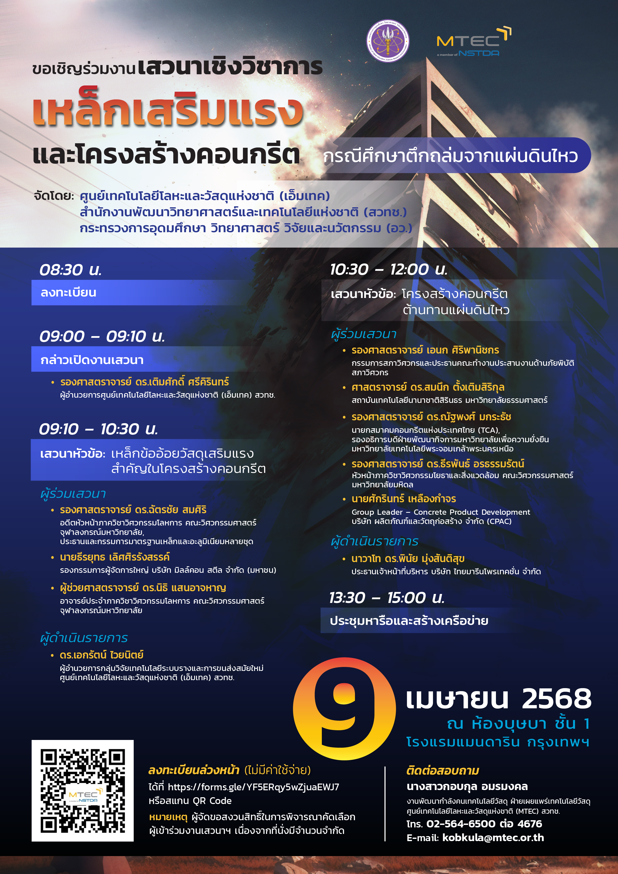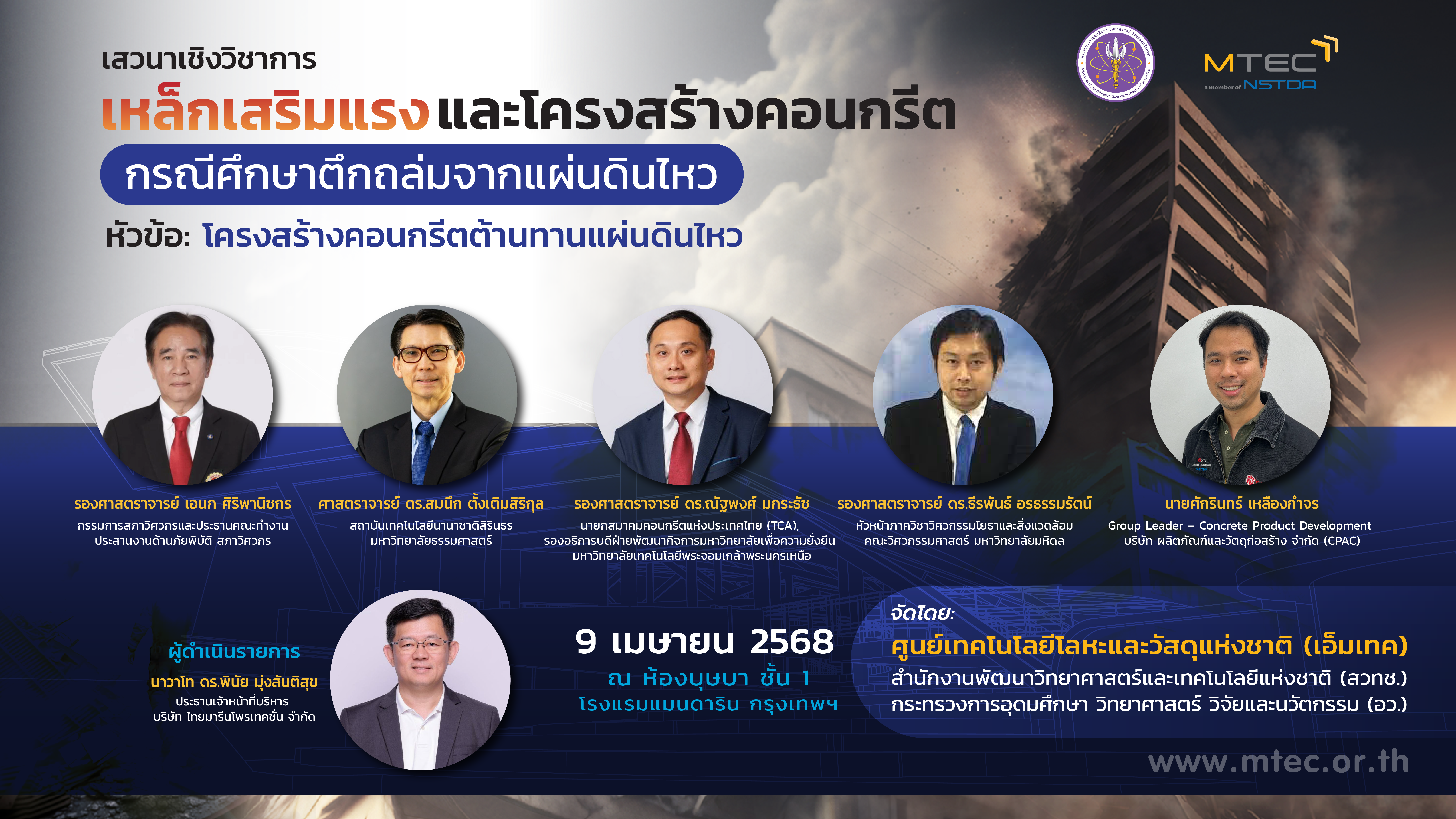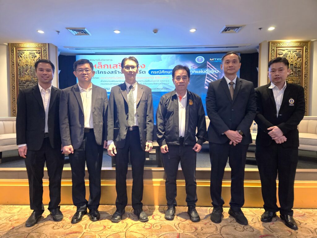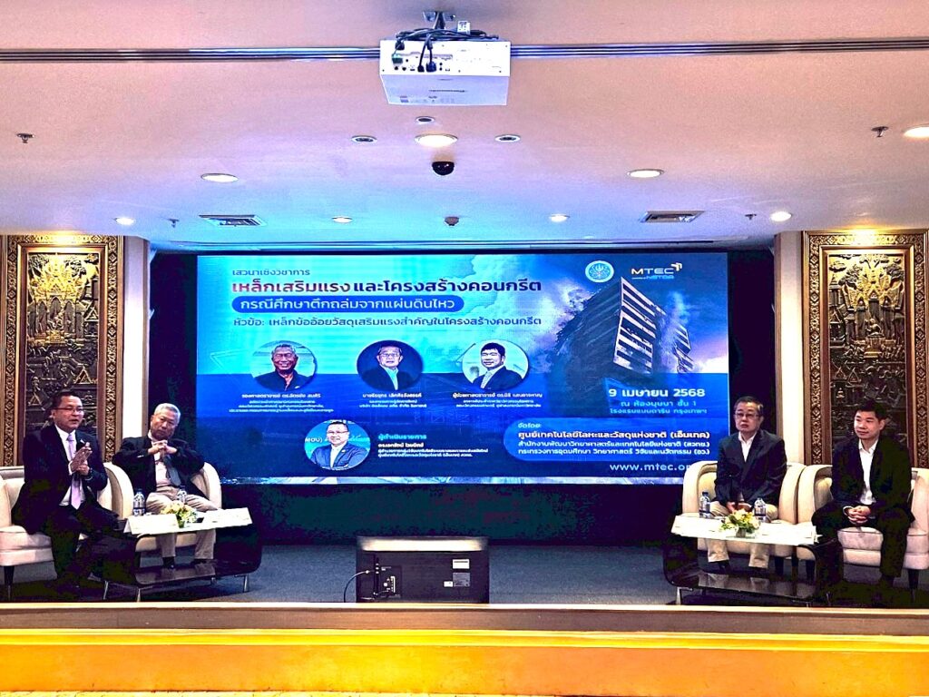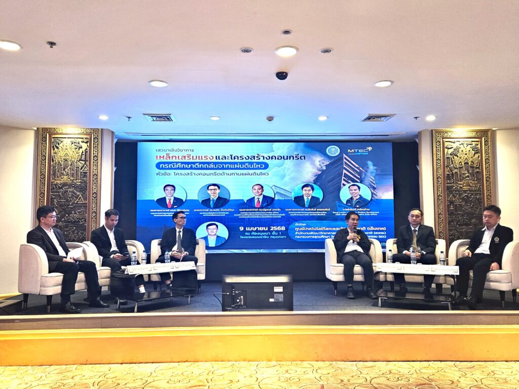 สำนักงานพัฒนาวิทยาศาสตร์และเทคโนโลยีแห่งชาติ (สวทช.) โดย ศูนย์เทคโนโลยีโลหะและวัสดุแห่งชาติ (เอ็มเทค) จัดงานเสวนาเชิงวิชาการในหัวข้อ “เหล็กเสริมแรงและโครงสร้างคอนกรีต: กรณีศึกษาตึกถล่มจากแผ่นดินไหว” งานเสวนาดังกล่าวได้รับเกียรติจาก รองศาสตราจารย์ ดร.เติมศักดิ์ ศรีคิรินทร์ ผู้อำนวยการเอ็มเทค เป็นประธานกล่าวเปิดงาน ซึ่งการจัดงานครั้งนี้มีวัตถุประสงค์เพื่อแลกเปลี่ยนความรู้และประสบการณ์เกี่ยวกับความสำคัญของเหล็กเสริมแรงและหลักการออกแบบโครงสร้างคอนกรีตเพื่อต้านทานแผ่นดินไหว โดยมีผู้เชี่ยวชาญระดับประเทศจากสถาบันการศึกษา องค์กรวิชาชีพ และภาคเอกชน ร่วมเป็นวิทยากร