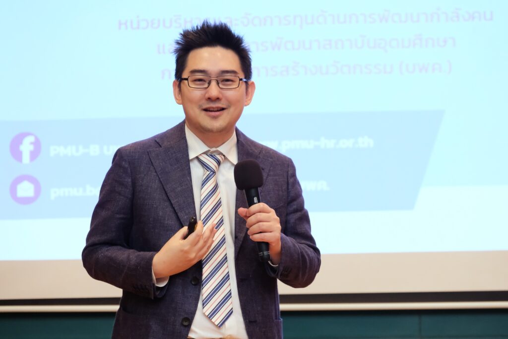 กิจกรรมการสัมมนาประกอบด้วยการบรรยายในหัวข้อ “นโยบายและแนวทางการสนับสนุนทุนวิจัย บพค.” โดย ดร.รัฐภูมิ ตู้จินดา รองผู้อำนวยการ บพค. ได้กล่าวถึงบทบาทของ บพค. ในการส่งเสริมการพัฒนากำลังคนสมรรถนะสูงและงานวิจัยขั้นแนวหน้า เพื่อเพิ่มขีดความสามารถการแข่งขันของประเทศอย่างยั่งยืน ผ่านกลไกการสนับสนุนทุนผ่านแผนงานที่หลากหลายที่สนับสนุนการการดำเนินงานตามประเด็นมุ่งเน้นในรูปแบบต่างๆ เช่น ทุนพัฒนานักวิจัยหลังปริญญา (Industrial Postdoc/Postgrad Fellowship) ทุนพัฒนาบุคลากรสมรรถนะสูงในภาคอุตสาหกรรม (Upskill/Reskill/Newskill) และทุนส่งเสริมความร่วมมือกับเครือข่ายพันธมิตรระดับนานาชาติ รวมถึงการลงทุนด้านโครงสร้างพื้นฐานวิทยาศาสตร์และเทคโนโลยี โดยคาดหวังให้เกิดการเชื่อมโยงองค์ความรู้สู่การใช้ประโยชน์ทั้งในเชิงพาณิชย์และสังคม เกิดผลกระทบในวงกว้างทั้งในระดับชาติและนานาชาติ นอกจากนี้ยังได้เน้นถึงแนวทางในการพัฒนาข้อเสนอโครงการที่ดีที่ บพค. มองหา เพื่อเพิ่มโอกาสในการได้รับทุน