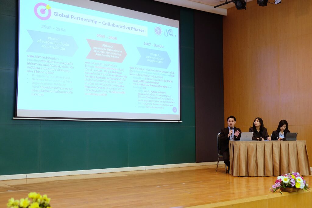 และการบรรยายในหัวข้อ “แนวทางการเขียนข้อเสนอโครงการเพื่อยกระดับการวิจัยและนวัตกรรมผ่านเครือข่ายความร่วมมือนานาชาติ” โดย นางสาวธนวรรณ ศรีทอง ผู้อำนวยการฝ่ายการพัฒนากำลังคนสมรรถนะสูงเชิงยุทธศาสตร์ ดร.สนธยา ชัยอาวุธ นักวิเคราะห์อาวุโส Global Partnership for Sustainability & Society และนางสาวณัฐสุภา น้อยภาษี นักวิเคราะห์ Global Partnership for Sustainability & Society ซึ่งเน้นการแลกเปลี่ยนประสบการณ์และเทคนิคการเขียนข้อเสนอโครงการที่ดี เพื่อเพิ่มโอกาสในการได้รับทุนจาก บพค. พร้อมแนะนำโปรแกรมต่างๆ ที่เปิดรับอยู่ในปี 2569 นี้ ภายใต้แผนงาน Global Partnership (N49) เพื่อส่งเสริมร่วมมือระดับโลกทั้งในรูปแบบ bilateral และ multilateral