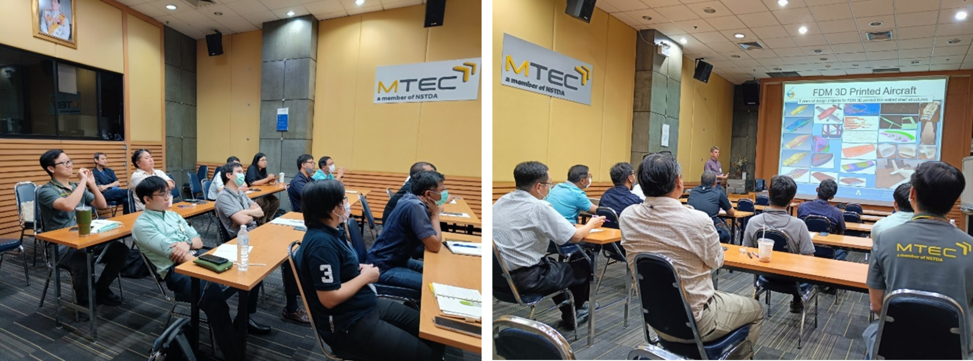 งานสัมมนาฯ ดังกล่าวมีวัตถุประสงค์เพื่อสนับสนุนการแลกเปลี่ยนความรู้และประสบการณ์การวิจัย เน้นการออกแบบโครงสร้างชิ้นส่วนสำหรับการผลิตแบบ additive manufacturing ซึ่งครอบคลุมทั้งการใช้ computational model และ design of experiment ในการวิเคราะห์โครงสร้าง โดยมีผู้สนใจเข้าร่วมสัมมนาทั้งจากภายในและภายนอก สวทช. กว่า 20 คน นอกจากนี้ทางวิทยากรและผู้เข้าร่วมสัมมนาได้เข้าเยี่ยมชมห้องปฏิบัติการของทีมวิจัยวัสดุเฉพาะทางสำหรับการประยุกต์ใช้ทางวิศวกรรม และห้องปฏิบัติการของทีมวิจัยวิศวกรรมน้ำหนักเบา อีกด้วย