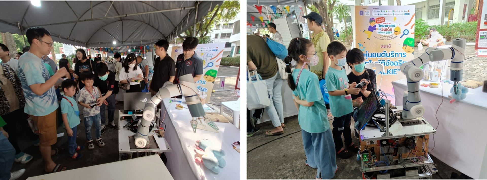 เอ็มเทค สวทช. ร่วมกับจุฬาลงกรณ์มหาวิทยาลัย นำหุ่นยนต์บริการอัตโนมัติอัจฉริยะ “WALKIE” หุ่นยนต์บริการในครัวเรือน หรือ Domestic service robot ที่สามารถทำงานบ้านได้ ยกข้าวของเครื่องใช้ได้ เพราะมี AI อัจฉริยะที่ทำให้รู้ว่าของต่าง ๆ ในบ้านอยู่ตรงไหน สามารถเดินไปห้องต่าง ๆ ได้อย่างอัตโนมัติ พร้อมโต้ตอบได้แบบ Real Time ซึ่งต้องใช้ศักยภาพของ 5G ในการทำงาน โดยเป็นโครงการของชมรมหุ่นยนต์แห่งวิศวฯ จุฬาฯ (EIC Chula) ที่ประกวดคว้าอันดับที่ 2 ของโลกมาได้ในรายการ RoboCup@Home Open Platform League มาร่วมจัดแสดงภายในงานด้วย