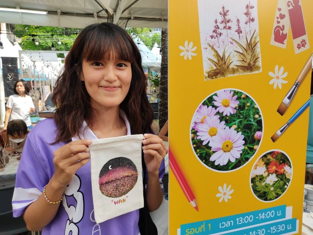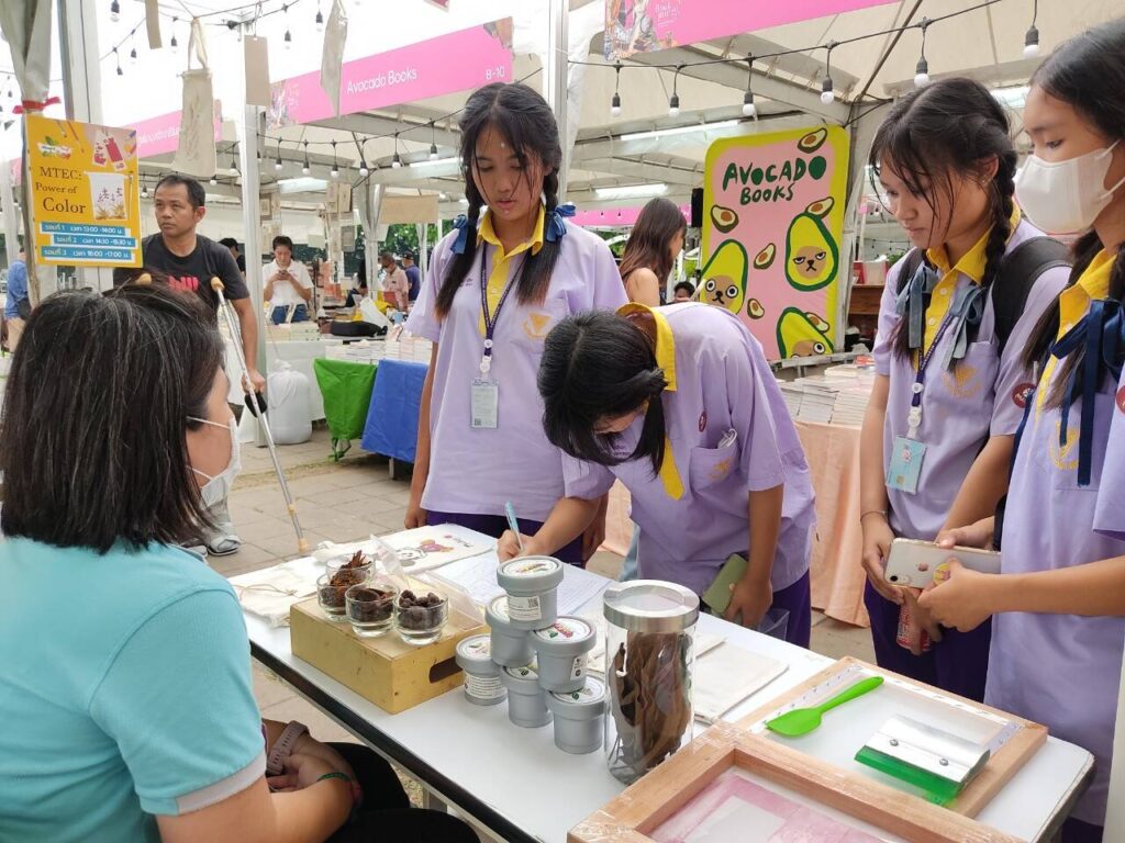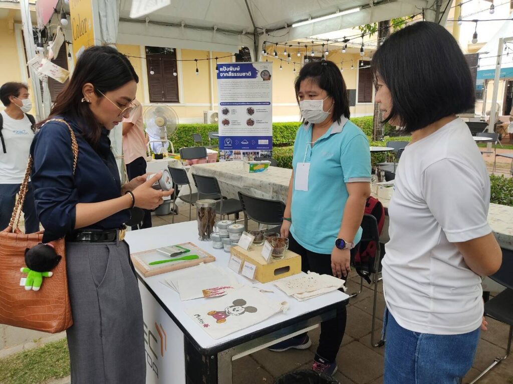 โดยงานนี้ศูนย์เทคโนโลยีโลหะและวัสดุแห่งชาติ (เอ็มเทค) สำนักงานพัฒนาวิทยาศาสตร์และเทคโนโลยีแห่งชาติ (สวทช.) จัดกิจกรรม Power of Color : Magik color แป้งพิมพ์ผ้าจากสีธรรมชาติ ลดการใช้สารเคมี กิจกรรมวาดภาพระบายสีกระเป๋าผ้าด้วยสีย้อมธรรมชาติ ‘แป้งพิมพ์ผ้า’ เป็นหนึ่งในวัตถุดิบสำคัญที่อุตสาหกรรมสิ่งทอทั่วโลกใช้พิมพ์ลวดลายลงบนผืนผ้าเพื่อถ่ายทอดผลงานการออกแบบ แต่แป้งพิมพ์ส่วนใหญ่ที่มีการใช้งานในปัจจุบันเป็น ‘แป้งพิมพ์ที่มีสีเคมีเป็นส่วนผสม’ ซึ่งอาจมีสารพิษที่เป็นอันตรายต่อผู้ใช้งานและก่อให้เกิดสารพิษตกค้างในสิ่งแวดล้อมได้ โดยผลิตภัณฑ์นี้นำจุดแข็งเรื่องความหลากหลายของทรัพยากรชีวภาพในประเทศไทยมาใช้สร้างสรรค์ผลิตภัณฑ์ ‘ให้มีสีสันสดใส หลากหลายเฉดสี’อีกด้วย