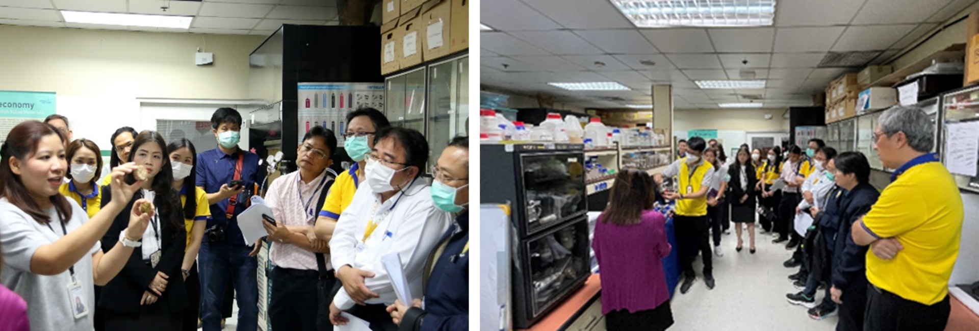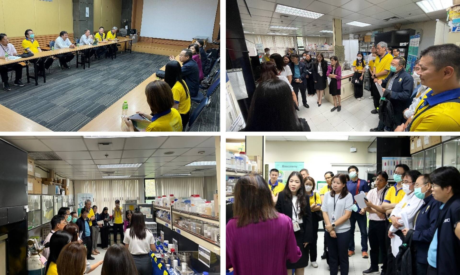 คณะบุคคลากรเยี่ยมชมจากหน่วยงานกฟผ.และวช. นำโดยนายวฤต รัตนชื่น ผู้ช่วยผู้ว่าการวิจัย นวัตกรรม และพัฒนาธุรกิจ นายสุพัฒนพงศ์ สิกขาบัณฑิต ผู้ช่วยผู้อำนวยการฝ่ายวิจัยและนวัตกรรม ทำการแทนผู้อำนวยการฝ่ายวิจัยและนวัตกรรม นายอำนวย ทองสถิตย์ และนายณพภณ กุลภัสราสร ผู้แทนผู้อำนวยการฝ่ายบริหารด้านการใช้ไฟฟ้าและกิจการเพื่อสังคม (อชก.) คณะผู้ทรงคุณวุฒิจากวช. นำโดย ดร.ขวัญฤดี โชติทนาทวีวงศ์ และ ศ.ดร.ไพศาล กิตติศุภกร ผอ.ศูนย์ขับเคลื่อนโครงการร่วมสนับสนุนทุนวิจัยและพัฒนา กฟผ.-วช. โดยการเยี่ยมชมห้องปฏิบัติการฯ ครั้งนี้ ทีมวิจัยได้ทำการสาธิตขั้นตอนการสังเคราะห์วัสดุและการเดินระบบการดักจับ CO2 และการลด PM2.5 โดยใช้วัสดุที่สังเคราะห์และพัฒนาจากเถ้าหนักถ่านหิน และสลัดจ์น้ำเสีย ซึ่งเป็นการเพิ่มมูลค่าผลิตผลพลอยได้ (by product) และลดของเสียจากกระบวนการผลิตไฟฟ้าจากการทำชุดโครงการ “การสังเคราะห์เถ้าหนักจากถ่านหินให้กลายเป็นวัสดุเพิ่มมูลค่า สำหรับการดักจับคาร์บอนไดออกไซด์และการลด PM2.5” โดยคณะเยี่ยมชมฯ และทีมวิจัยได้ร่วมกันการหารือข้อมูลการวิจัย แสดงความเห็นและปรึกษาเพื่อต่อยอดและขับเคลื่อน ยกระดับงานวิจัย พัฒนา และนวัตกรรม รวมถึงการสนับสนุนการดำเนินโครงการของทีมวิจัยฯ ต่อไปไปในอนาคต