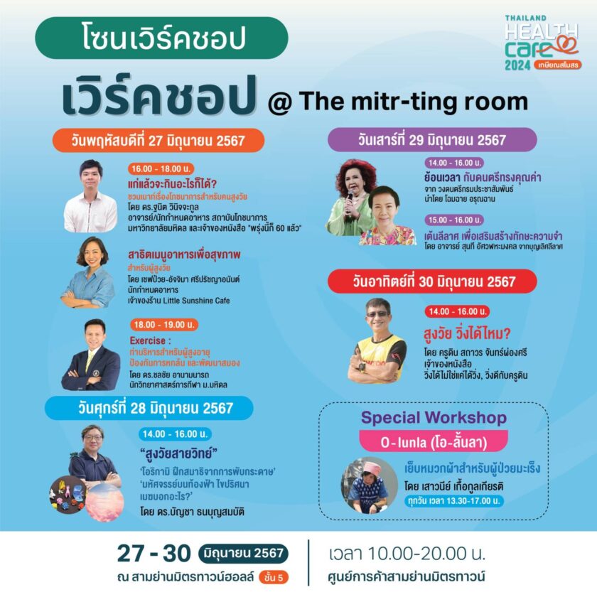 พบกันในงาน “Thailand Healthcare 2024 เกษียณสโมสร” วันที่ 27-30 มิถุนายน 2567 เวลา 10.00-20.00 น. สามย่านมิตรทาวน์ฮอลล์ ชั้น 5 ศูนย์การค้าสามย่านมิตรทาวน์ เดินทางสะดวกปลอดภัยด้วยรถไฟฟ้า MRT สายสีน้ำเงิน ลงสถานีสามย่าน ทางออก 2