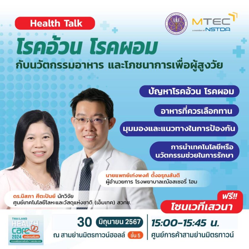 นอกจากนี้ ขอเชิญผู้สนใจ ร่วมรับฟังการเสวนา Health Talk 📌“โรคอ้วน โรคผอม กับนวัตกรรมอาหาร และโภชนาการเพื่อผู้สูงวัย” โดยแพทย์ผู้เชี่ยวชาญ นายแพทย์เก่งพงศ์ ตั้งอรุณสันติ ผู้อำนวยการ โรงพยาบาลเฌ้อสเซอรี่ โฮม และ ดร.นิสภา ศีตะปันย์ นักวิจัย เอ็มเทค สวทช. พูดคุยถึง ▪️ สาเหตุของปัญหาโรคอ้วน โรคผอม ▪️ แนะนำอาหารที่ควรเลือกทาน ▪️ มุมมอง และแนวทางในการป้องกัน ▪️ การนำเทคโนโลยี หรือนวตกรรมมาช่วยในการรักษา