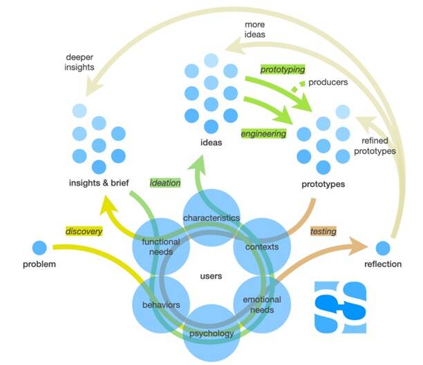 เราใช้กระบวนการ Human-centric design ซึ่งเป็นแนวคิดที่เริ่มโดยคุณ Don Norman ซึ่งเป็นนักออกแบบชื่อดังคนหนึ่งมาหลายสิบปี คือ แทนที่จะออกแบบในสตูดิโอหรือบนหิ้ง นักออกแบบควรเอาผู้ใช้เป็นศูนย์กลาง ที่เรียกว่า Human-centered design หรือ Human-centric design หรือ User-centered design ซึ่งเป็นกระบวนการที่มี 4 ขั้นตอน คือ