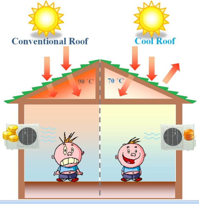 แผนภาพแสดงคลื่นแสงจากดวงอาทิตย์ที่ถูกดูดซับและสะท้อนโดยหลังคาปกติ (conventional roof) และหลังคาสะท้อนความร้อน (cool roof) หากการดูดซับมีค่าสูงจะทำให้อุณหภูมิภายในอาคารสูงขึ้น การทำให้ปริมาณการสะท้อนสูงกว่าการดูดซับมากๆ จะทำให้ภายในอาคารเย็น