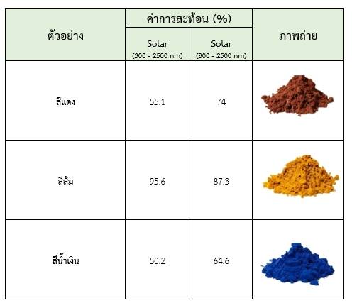 ทีมวิจัยได้นำผงสีแดง ส้ม และน้ำเงินที่สังเคราะห์ได้ไปวัดค่าการสะท้อนรังสีอาทิตย์ด้วยเครื่อง UV-VIS-NIR Spectrophotometer และคำนวณค่าการสะท้อนรังสีอาทิตย์ช่วงอินฟราเรดใกล้ตามมาตรฐาน ASTM E903-87 ได้ค่าดังตาราง