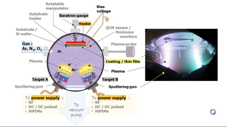ภาพที่ 3 แผนภาพภายในห้องสุญญากาศของ PVD-Sputtering (ซ้าย) การจัดวางตำแหน่งของส่วนประกอบอุปกรณ์ ประกอบด้วยหัวสปัตเตอริง (sputtering gun) 2 หัวที่ทำมุมเอียงไปยังชิ้นงาน (substrate) ในตำแหน่งด้านบน ส่วนหัวสปัตเตอริงประกอบด้วยขั้วไฟฟ้าและแม่เหล็ก (ขวา) การเคลือบฟิล์มบางจากเป้า 2 ชนิด (co-sputtering)