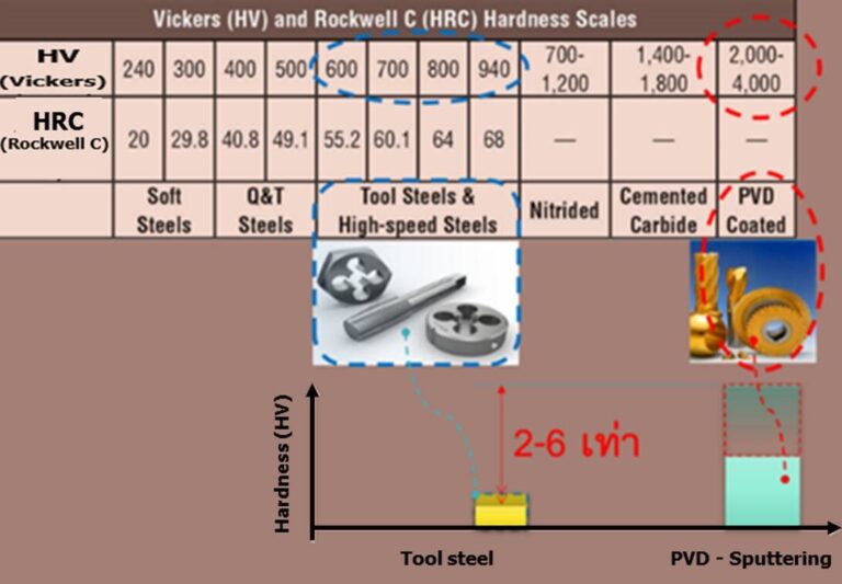 ภาพที่ 4 เปรียบเทียบความแข็งของเหล็กกล้าเครื่องมือ และฟิล์มบางเซรามิกจากเทคนิค PVD -Sputtering