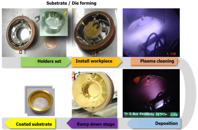 ภาพที่ 5 แผนภาพขั้นตอนการเคลือบผิวฟิล์มบาง TiN, TiAlN บน Die forming ที่ใช้สำหรับการขึ้นรูปโลหะแผ่น ซึ่งเป็นงานวิจัยของ เอ็มเทค