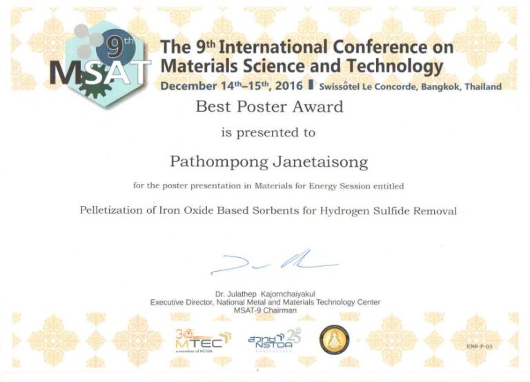 Best Poster Award in Materials for Energy at The 9th International Conference on Materials Science and Technology (MSAT-9)