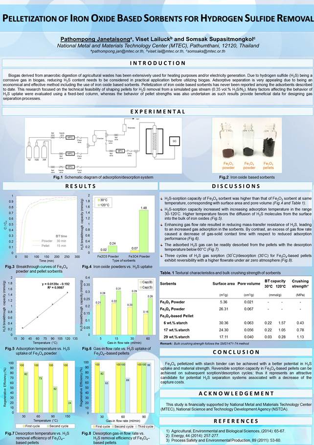 แก๊สชีวภาพเป็นพลังงานทางเลือกที่สามารถผลิตได้ด้วยการหมักของเสียจากการเกษตร ซึ่งปัจจุบันมีการใช้งานในหลากหลายทาง เช่น ใช้เป็นเชื้อเพลิงสำหรับให้ความร้อน ใช้ในการผลิตกระแสไฟฟ้า เป็นต้น อย่างไรก็ตามแก๊สชีวภาพที่ผลิตได้มักจะมีแก๊สไฮโดรเจนซัลไฟด์ (H2S) เป็นส่วนประกอบหนึ่งเสมอ ซึ่งแก๊สดังกล่าวเป็นมีฤทธิ์เป็นกรด ทำอันตรายต่อทั้งผู้ใช้งานและอุปกรณ์ที่ใช้ในการขนส่งแก๊ส ดังนั้นในงานวิจัยนี้จึงนำเสนอวิธีการกำจัดแก๊ส H2S ออกจากแก๊สชีวภาพด้วยการใช้ตัวดูดซับแก๊สที่ทำจากเหล็กออกไซด์ วัตถุประสงค์เพื่อให้ได้แก๊สชีวภาพที่ความบริสุทธิ์สูงเหมาะสมกับการนำไปใช้งาน