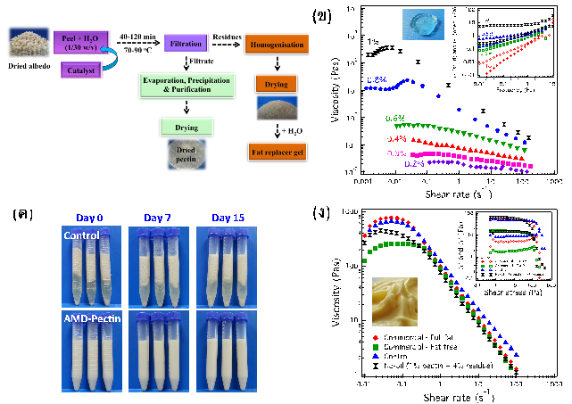 ปัจจุบันผู้บริโภคหันมาเลือกรับประทานอาหารเพื่อสุขภาพมากขึ้น แต่ปัญหาที่พบคือผลิตภัณฑ์อาหารที่ถูกลดไขมัน/น้ำตาลลง จะมีลักษณะปรากฏ รสชาติ รวมทั้งเนื้อสัมผัสที่ด้อยลง ซึ่งจากงานวิจัยนี้พบว่าเพคตินและเส้นใยอาหารจากเปลือกส่วนขาวของส้มโอ เป็นสารปรับเนื้อสัมผัสและสารทดแทนไขมันที่ดี โดยเริ่มจากศึกษาปัจจัยในกระบวนการสกัดเพคติน(รูปที่ ๑ก) ที่มีผลต่อปริมาณผลผลิตและสมบัติของเพคติน จนได้สภาวะที่เหมาะสมทำให้ได้เพคตินที่มีคุณสมบัติเด่น คือเจลเพคตินมีความแข็งแรงมากกว่าเจลเพคตินทางการค้าที่มีค่า degree of esterification และน้ำหนักโมเลกุลเฉลี่ยใกล้เคียงกัน (รูปที่ ๑ข) นอกจากนี้ยังพบว่า เพคตินจากเปลือกส้มโอมีความว่องไวต่อไอออนประจุสองบวก ทำให้เจลมีความแข็งแรงเพิ่มขึ้น และจากการวิเคราะห์องค์ประกอบและโครงสร้างทางเคมีพบว่าเพคตินจากเปลือกส้มโอประกอบด้วย กรดกาแลคทูโรนิกเป็นสายโซ่หลักเช่นเดียวกันกับเพคตินทางการค้า แต่สิ่งที่ต่างกันคือ สายโซ่กิ่งของเพคตินจากเปลือกส้มโอ ประกอบด้วยน้ำตาลอะราบิโนสสูงกว่าน้ำตาลกาแลคโตส ซึ่งความแตกต่างนี้น่าสนใจและอาจนำไปสู่การใช้งานที่กว้างขวางมากขึ้น ในส่วนสุดท้ายของงานวิจัย เพคตินและเส้นใยอาหารจากเปลือกส้มโอ ได้ถูกนำมาประยุกต์ใช้ในผลิตภัณฑ์นมเปรี้ยวเสริมแคลเซียม(รูปที่ ๑ค) และอาหารไขมันต่ำ ได้แก่ มายองเนสไร้ไขมัน (รูปที่ ๑ง) และสปันจ์เค้กไขมันต่ำ โดยผลิตภัณฑ์อาหารดังกล่าวมีลักษณะปรากฎ คุณภาพเนื้อสัมผัส และสมบัติรีโอโลยีเทียบเท่ากับสูตรไขมันเต็ม