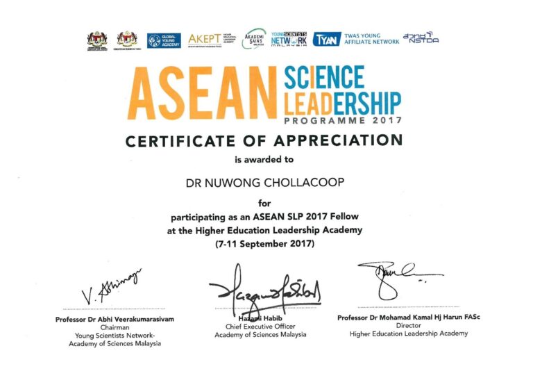 ชื่อรางวัลและเกียรติยศที่ได้รับ : Certificate for 2017 ASEAN Science Leadership Programme (SLP)