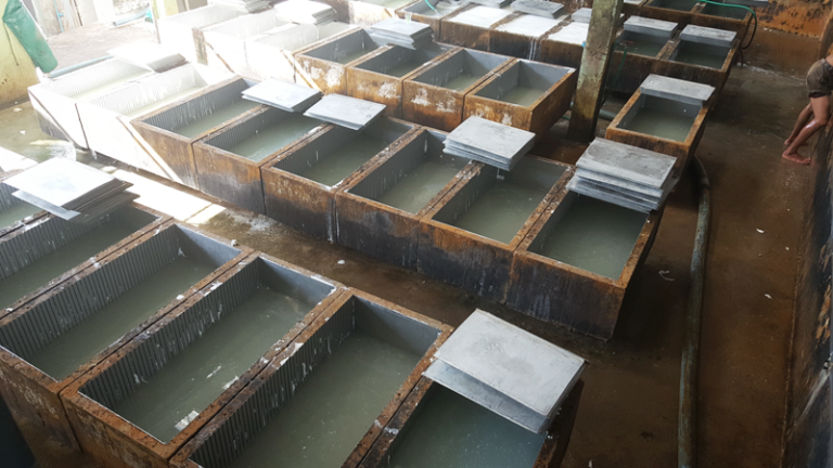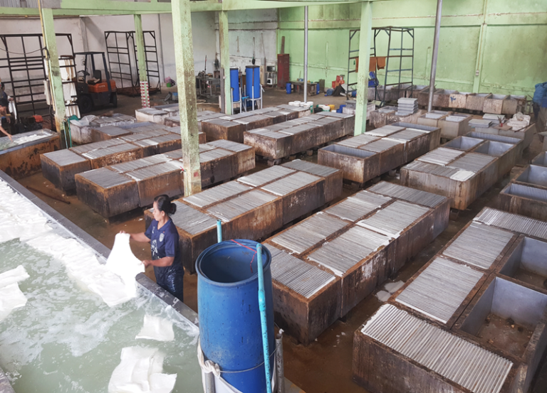 รูปที่ 1 ขั้นตอนการจับตัวน้ำยางสดเป็นเป็นแผ่นยางเต้าหู้ (ในกระบวนการผลิตยางแผ่นรมควัน)