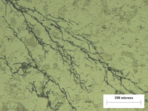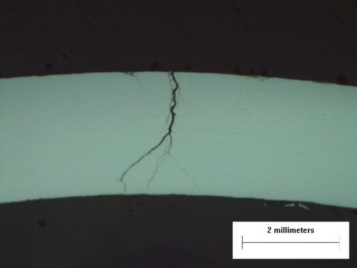 ภาพภาคตัดขวางท่อแสดงการแตกแบบแขนง บ่งบอกลักษณะการกัดกร่อนภายใต้แรงเค้น (Stress corrosion crack)