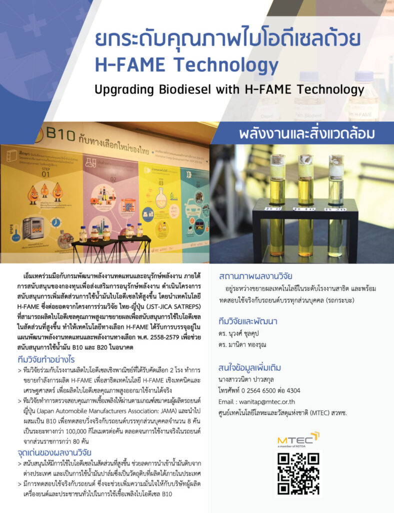 เอ็มเทคร่วมมือกับกรมพัฒนาพลังงานทดแทนและอนุรักษ์พลังงาน ภายใต้การสนับสนุนของกองทุนเพื่อส่งเสริมการอนุรักษ์พลังงาน ดำเนินโครงการสนับสนุนการเพิ่มสัดส่วนการใช้น้ำมันไบโอดีเซลให้สูงขึ้น โดยนำเทคโนโลยี H-FAME ซึ่งต่อยอดจากโครงการร่วมวิจัย ไทย-ญี่ปุ่น (JST-JICA SATREPS) ที่สามารถผลิตไบโอดีเซลคุณภาพสูงมาขยายผลเพื่อสนับสนุนการใช้ไบโอดีเซลในสัดส่วนที่สูงขึ้น ทำให้เทคโนโลยีทางเลือก H-FAME ได้รับการบรรจุอยู่ในแผนพัฒนาพลังงานทดแทนและพลังงานทางเลือก พ.ศ. 2558-2579 เพื่อช่วยสนับสนุนการใช้น้ำมัน B10 และ B20 ในอนาคต
