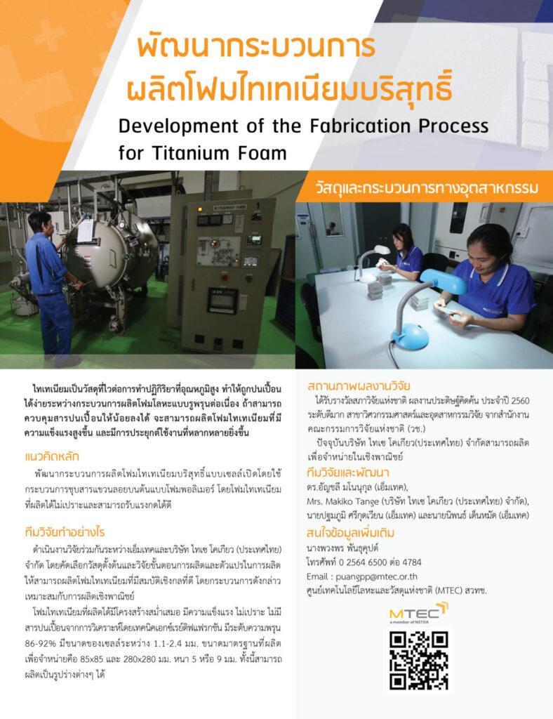 3. ทดสอบกระบวนการผลิตในระดับประลองและต่อเนื่องในระดับอุตสาหกรรมที่บริษัท โดยทีมวิจัยของเอ็มเทคให้คำปรึกษาตลอดการทดสอบ (1 ส.ค. – 31 ต.ค. 2559)