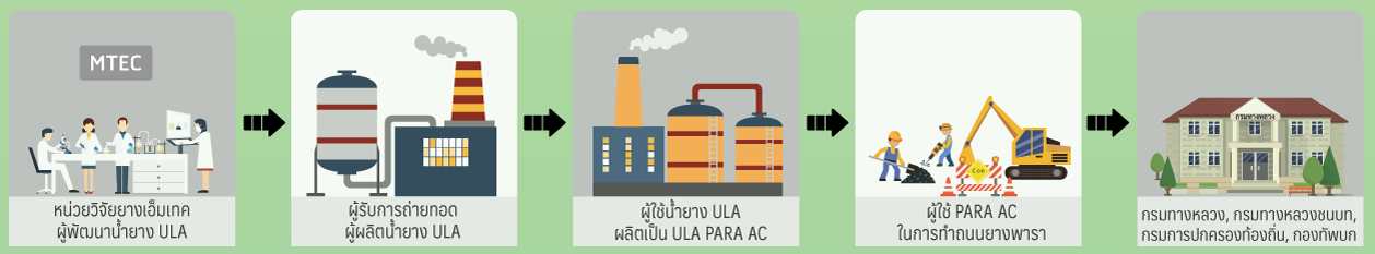 ทีมวิจัยที่มีความเชี่ยวชาญด้านน้ำยางจากเอ็มเทคประกอบด้วยนายสุริยกมล มณฑา นางสาวปิยะดา สุวรรณดิษฐากุล และนางฉวีวรรณ คงแก้ว ได้พัฒนาน้ำยางพาราข้นเกรดพิเศษ ชื่อว่า น้ำยาง ULA (Ultra-Low Ammonia latex) ซึ่งมีปริมาณแอมโมเนียต่ำมากและมีเสถียรภาพด้านความร้อนสูง ทำให้มีคุณสมบัติเหมาะสมสำหรับผสมกับแอสฟัลต์ โดยบริษัท ไทยอีสเทิร์น รับเบอร์ จำกัด เป็นผู้ผลิตวัตถุดิบน้ำยาง ULA ให้แก่บริษัท ทิปโก้แอสฟัลท์ จำกัด (มหาชน) เพื่อผลิต ULA-PARA AC สำหรับทำถนน