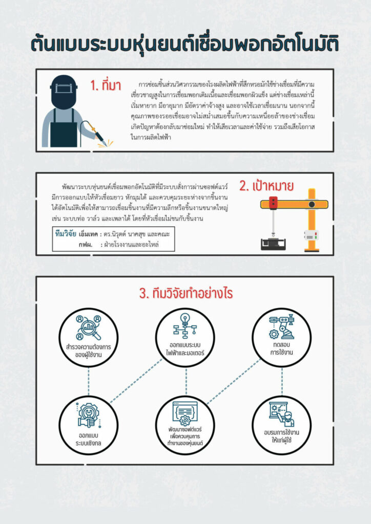 พัฒนาระบบหุ่นยนต์เชื่อมพอกอัตโนมัติที่มีระบบสั่งการผ่านซอฟต์แวร์ มีการออกแบบให้หัวเชื่อมยาว หักมุมได้ และควบคุมระยะห่างจากชิ้นงานได้อัตโนมัติ เพื่อให้สามารถเชื่อมชิ้นงานที่มีความลึกหรือชิ้นงานขนาดใหญ่ เช่น ระบบท่อ วาล์ว และเพลาได้ โดยที่หัวเชื่อมไม่ชนกับชิ้นงาน