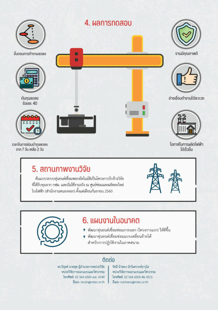 ต้นแบบระบบหุ่นยนต์เชื่อมพอกอัตโนมัติเป็นโครงการรับจ้างวิจัยที่ได้รับทุนจาก กฟผ. และเริ่มใช้งานจริง ณ ศูนย์ซ่อมและผลิตอะไหล่โรงไฟฟ้า (สำนักงานหนองจอก) ตั้งแต่เดือนกันยายน 2560