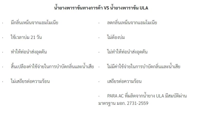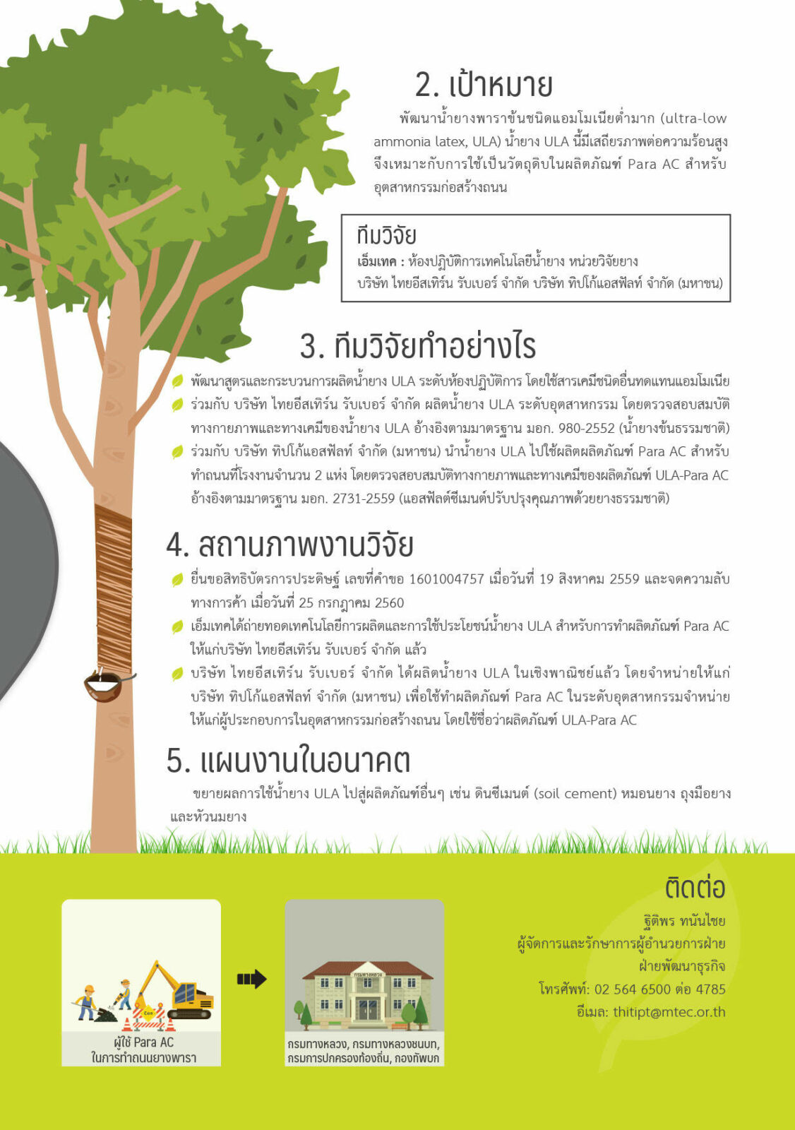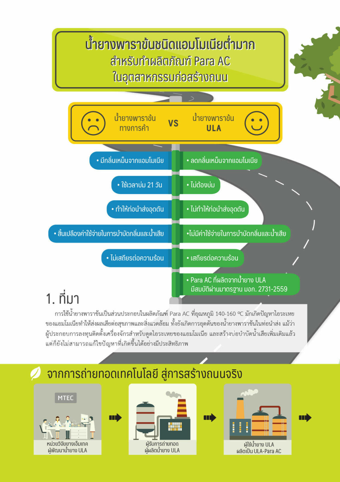 พัฒนาน้ำยางพาราข้นชนิดแอมโมเนียต่ำมาก (ultra-low ammonia latex, ULA) น้ำยาง ULA นี้มีเสถียรภาพต่อความร้อนสูง จึงเหมาะกับการใช้เป็นวัตถุดิบในผลิตภัณฑ์ PARA AC สำหรับอุตสาหกรรมก่อสร้างถนน