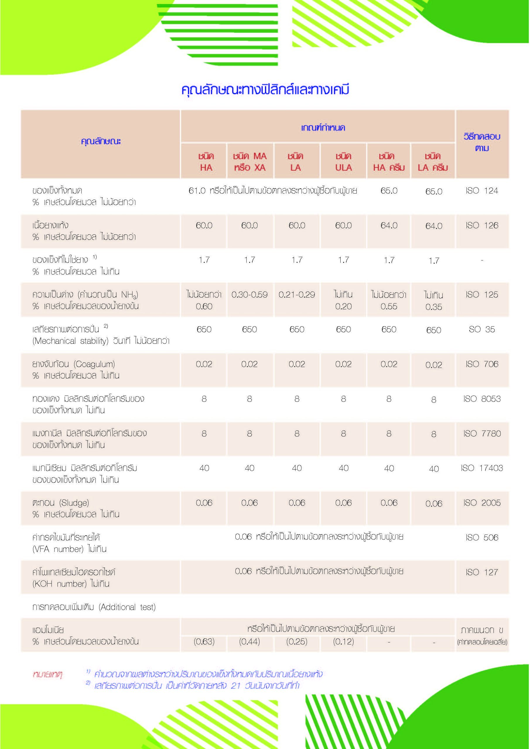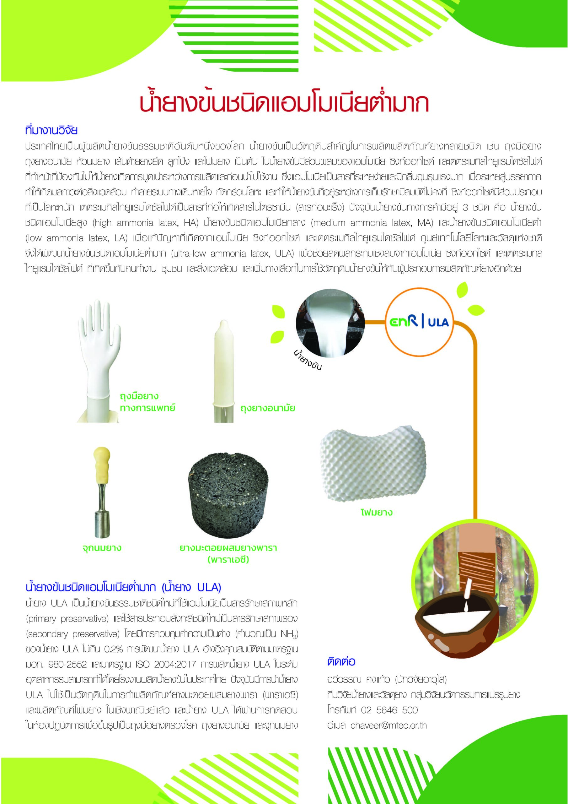 - พัฒนาสูตรและกระบวนการผลิตน้ำยาง ULA ระดับห้องปฏิบัติการ โดยใช้สารเคมีชนิดอื่นทดแทนแอมโมเนีย