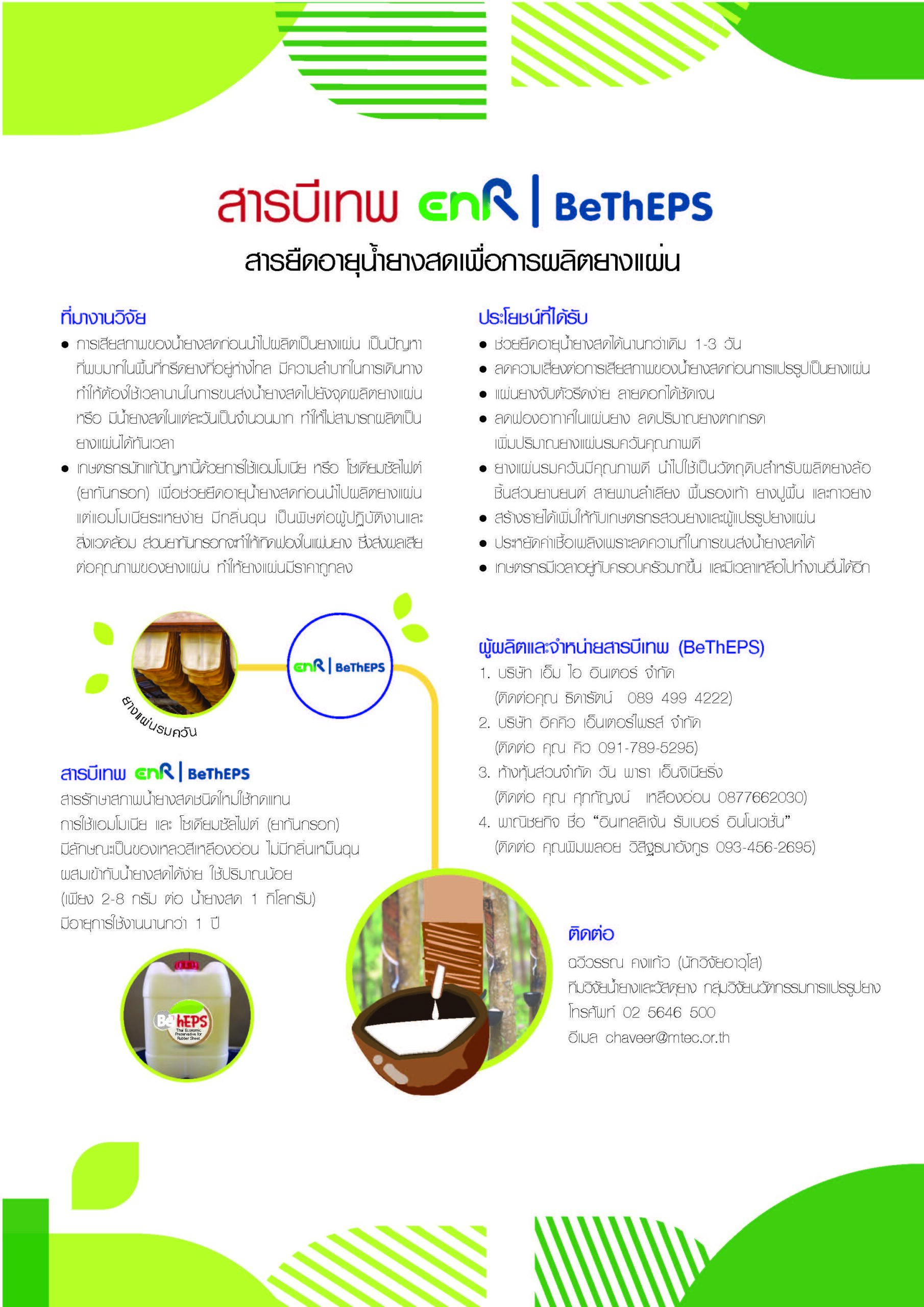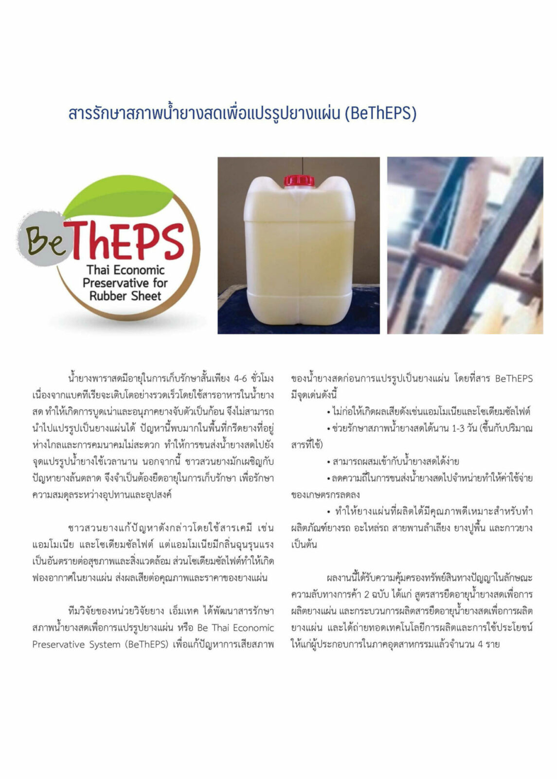 ทีมวิจัยของหน่วยวิจัยยาง เอ็มเทค ได้พัฒนาสารรักษาสภาพน้ำยางสดเพื่อการแปรรูปยางแผ่น หรือ Be Thai Economic Preservative System (BeThEPS) เพื่อแก้ปัญหาการเสียสภาพของน้ำยางสดก่อนการแปรรูปเป็นยางแผ่น โดยที่สาร BeThEPS มีจุดเด่นดังนี้