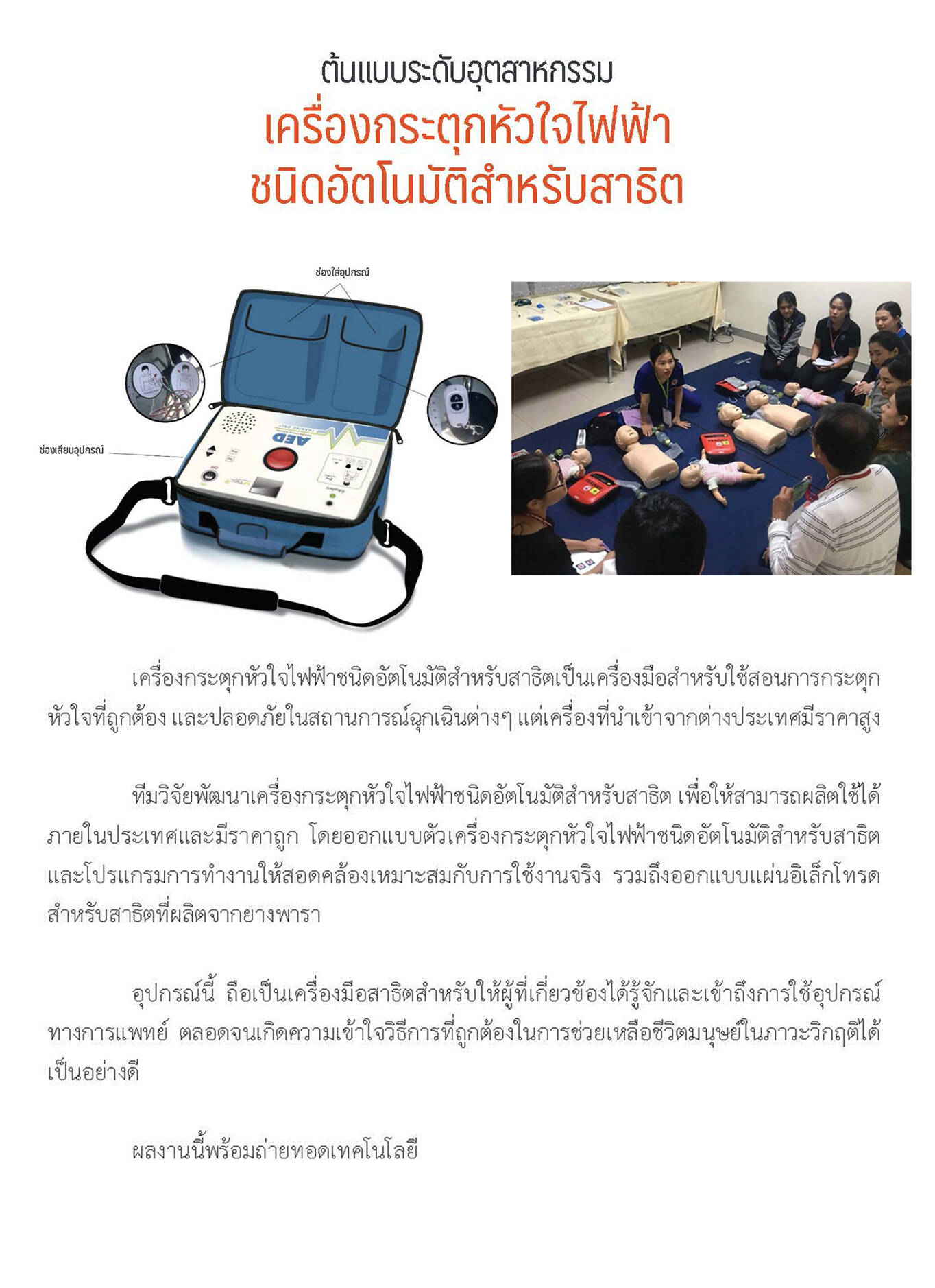 ทีมวิจัยทำอย่างไรศูนย์เทคโนโลยีโลหะและวัสดุแห่งชาติ ด้วยการสนับสนุนจากคณะกรรมการมาตรฐานการช่วยชีวิตซึ่งก่อตั้งโดยสมาคมแพทย์โรคหัวใจแห่งประเทศไทยในพระบรมราชูปถัมภ์ ได้พัฒนาเครื่องช่วยสาธิตการช็อกไฟฟ้าหัวใจอัตโนมัติในนามของเครือข่ายนวัตกรรมยางพาราที่สอดคล้องกับการใช้งาน และพัฒนาแผ่นอิเล็กโทรดสำหรับสาธิตจากยางพาราซึ่งทำให้มีราคาถูกและได้ใช้วัตถุดิบในประเทศ