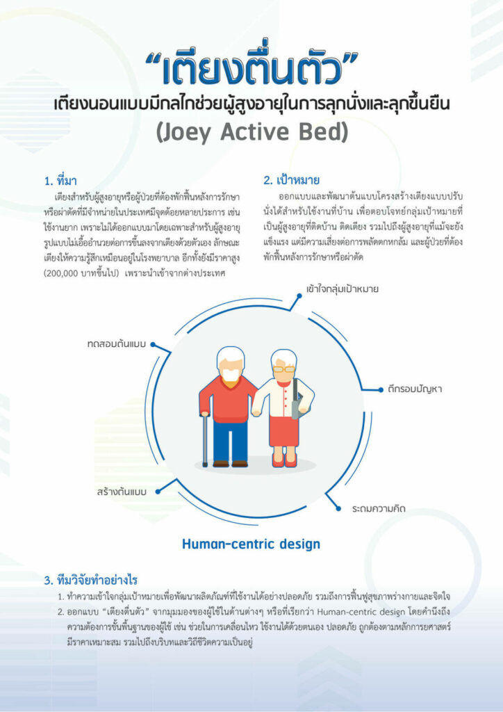 2. ออกแบบ “เตียงตื่นตัว” จากมุมมองของผู้ใช้ในด้านต่างๆ หรือที่เรียกว่า “Human-centric design” โดยคำนึงถึงความต้องการขั้นพื้นฐานของผู้ใช้ เช่น ช่วยในการเคลื่อนไหว ใช้งานได้ด้วยตนเอง ปลอดภัย ถูกต้องตามหลักการยศาสตร์ มีราคาเหมาะสม รวมไปถึงบริบทและวิถีชีวิตความเป็นอยู่