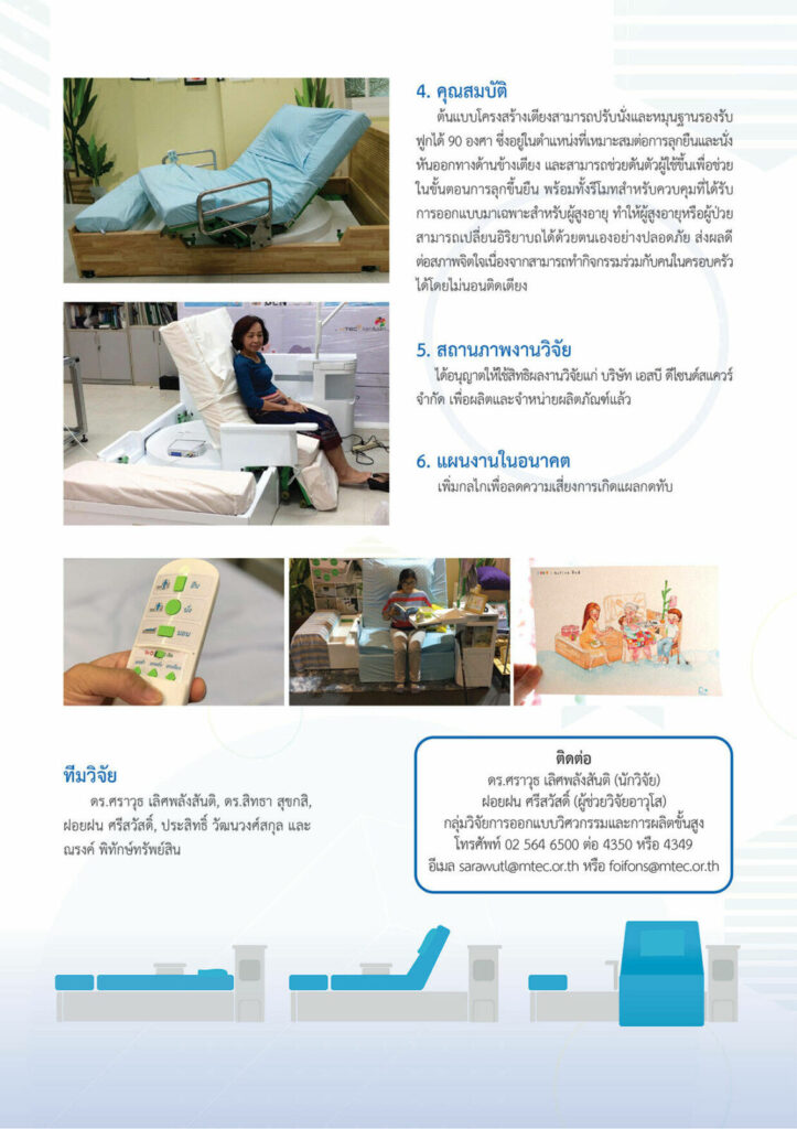 ออกแบบและพัฒนาต้นแบบโครงสร้างเตียงแบบปรับนั่งได้สำหรับใช้งานที่บ้าน เพื่อตอบโจทย์กลุ่มเป้าหมายที่เป็นผู้สูงอายุที่ติดบ้าน ติดเตียง รวมไปถึงผู้สูงอายุที่แม้จะยังแข็งแรง แต่มีความเสี่ยงต่อการพลัดตกหกล้ม และผู้ป่วยที่ต้องพักฟื้นหลังการรักษาหรือผ่าตัด