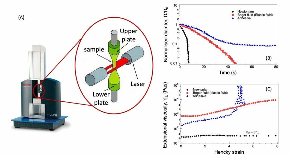รูปที่ 7 (A) การทดสอบสมบัติรีโอโลยีแบบดึงยืดด้วยเทคนิค Capillary Break-up Extensional Rheometry (CaBER) ด้วยเครื่องรีโอมิเตอร์ CaBER1 (Thermo Haake GmbH, Karlsruhe, Germany) และตัวอย่างผลการทดสอบที่ได้แสดงในรูปความสัมพันธ์ระหว่าง (B) ขนาดเส้นผ่านศูนย์กลางของฟิลาเมนต์เป็นฟังก์ชันของเวลา และ (C) ความหนืดแบบดึงยืดเป็นฟังก์ชันของค่าความเครียดแบบ Hencky สำหรับตัวอย่างของไหลนิวโทเนียน (newtonian fluid), Boger fluid หรือกาว (adhesive) [14]