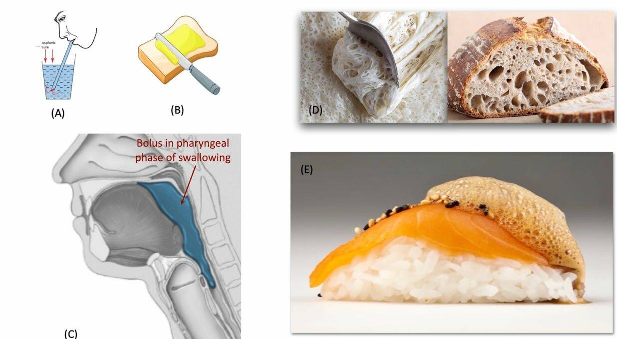 รูปที่ 1 ตัวอย่างรีโอโลยีแบบดึงยืดที่เกี่ยวข้องกับชีวิตประจำวัน (A) การดูดของเหลวจากหลอด, (B) การปาดทาเนยหรือแยมบนขนมปัง, (C) การกลืนโบลัสอาหารในระยะคอหอย, (D) การทำขนมปัง [2] และ (E) การออกแบบอาหารแบบโมเลคิวลาร์แกสโทรโนมี (molecular gastronomy)