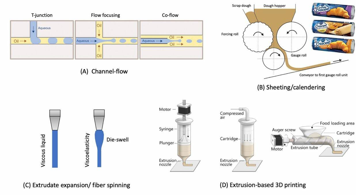รูปที่ 2 ตัวอย่างกระบวนการต่างๆ ที่เกี่ยวข้องกับสมบัติการไหลแบบดึงยืด (A) การไหลในท่อแคบ (channel-flow) ในระบบไมโครฟลูอิดิกส์ (microfluidics), (B) การรีดและม้วนแป้งโด (sheeting/calendering), (C) การพองตัวของเอ็กซ์ทรูเดต/การปั่นเส้นใย (extrudate expansion/fiber spinning) และ (D) การพิมพ์อาหาร 3 มิติโดยกระบวนการเอ็กซ์ทรูชัน (extrusion-based 3D printing)