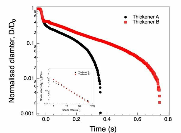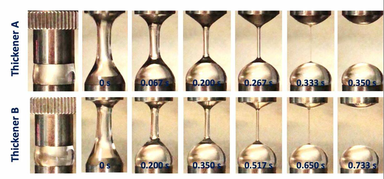 อย่างไรก็ดี เมื่อนำตัวอย่างทั้งสองไปวิเคราะห์การไหลแบบดึงยืดด้วยเครื่องรีโอมิเตอร์แบบดึงยืด HAAKE CaBER1 พบว่าทั้ง 2 ตัวอย่างมีพฤติกรรมการไหลแบบดึงยืดที่แตกต่างกันอย่างชัดเจน กล่าวคือ ฟิลาเมนต์ (filament) ของตัวอย่าง Thickener A ขาดเร็วกว่าตัวอย่าง Thickener B (รูปที่ 3 และ 4) แสดงถึงอันตรกิริยาระหว่างโมเลกุลภายในตัวอย่าง Thickener B ที่แข็งแรงกว่า Thickener A ซึ่งอาจเป็นผลมาจากขนาดโมเลกุลหรือลักษณะโครงสร้างโมเลกุลขององค์ประกอบที่อยู่ในผงเพิ่มความหนืดนั้น [10]