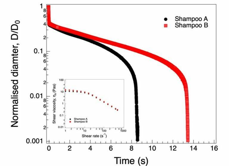 ส่วนการพัฒนาผลิตภัณฑ์ของใช้ส่วนตัว เช่น แชมพูบรรจุซอง ที่จำเป็นต้องมีการควบคุมพฤติกรรมการไหลในระหว่างกระบวนการผลิตให้เหมาะสม กล่าวคือสมบัติการไหลแบบดึงยืดช่วยให้การควบคุมปริมาณแชมพูที่จะบรรจุในแต่ละซองได้อย่างถูกต้อง และลดการสูญเสียในระหว่างกระบวนการผลิต จากการทดสอบสมบัติรีโอโลยีของผลิตภัณฑ์แชมพูในตัวอย่าง 2 ชนิดพบว่า มีค่าความหนืดเฉือนไม่แตกต่างกันอย่างมีนัยสำคัญ (รูปแทรกในรูปที่ 5) แต่เมื่อวิเคราะห์สมบัติการไหลแบบดึงยืดพบว่า ทั้งสองตัวอย่างมีการขาดของฟิลาเมนต์ที่เวลาแตกต่างกันอย่างชัดเจน (รูปที่ 5) โดยฟิลาเมนต์ของ Shampoo A ขาดเร็วกว่า Shampoo B ทำให้การบรรจุลงบรรจุภัณฑ์ง่ายและรวดเร็วกว่า
