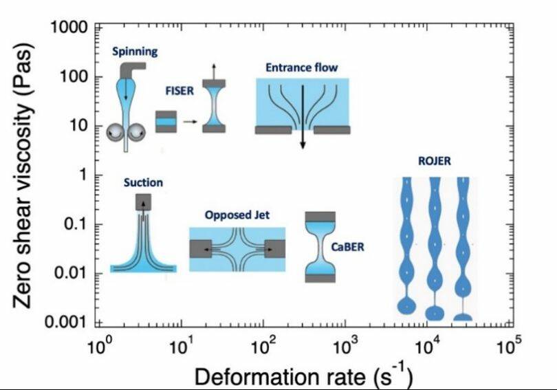 ที่ผ่านมามีการวิจัยและพัฒนาเทคนิคและเครื่องมือสำหรับทดสอบความหนืดแบบดึงยืดและวิเคราะห์สมบัติการไหลแบบดึงยืดหลากหลายวิธี เช่น เทคนิค Entrance capillary flows, two- หรือ four-roll mills, thread-line rheometry, Filament-Stretching Extensional Rheometry (FISER), Rayleigh Ohnesorge Jetting Extensional Rheometry (ROJER), Dripping-onto-Substrate (DoS) rheometry และ Capillary break-up Extensional Rheometry (CaBER) [9-12] โดยแต่ละเทคนิคมีช่วงที่สามารถวิเคราะห์สมบัติการไหลแบบดึงยืดของตัวอย่างได้เหมาะสม อ้างอิงตามค่าความหนืดที่อัตราเฉือนเข้าใกล้ศูนย์ (zero shear viscosity) ของตัวอย่างและอัตราการเสียรูป (deformation rate) ของแต่ละเทคนิค ดังแสดงในรูปที่ 5