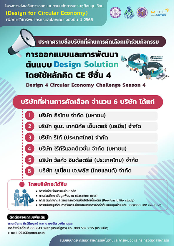 ประกาศรายชื่อบริษัทที่ผ่านการคัดเลือกเข้าร่วมกิจกรรม: การออกแบบและการพัฒนาต้นแบบ Design Solution โดยใช้หลักคิด CE ซีซั่น 4