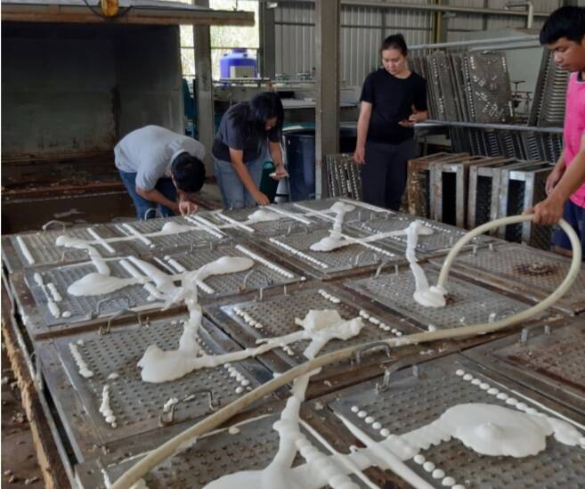 คุณอนันต์เล่าว่า “ในปี 2559 เริ่มติดตั้งเครื่องมือบางส่วน โดยเริ่มจากเครื่องฉีดก่อน เมื่อติดตั้งเสร็จก็มีคนมาสอนวิธีการใช้เครื่องและขั้นตอนการทำหมอนยางพารา แต่สูตรที่ทำให้หมอนมีคุณภาพดีต้องมาปรับเองในภายหลัง”