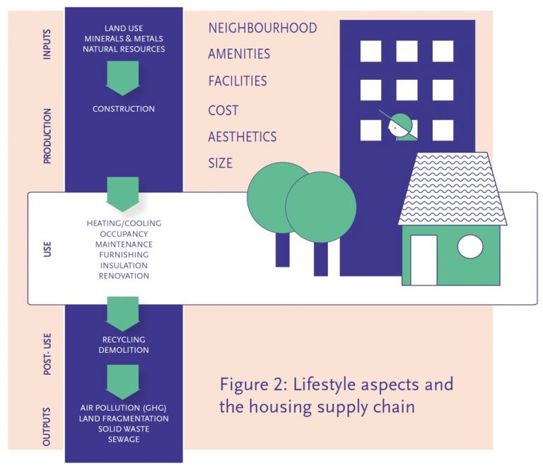 • ที่อยู่อาศัย (Housing) : วิธีที่เราอาศัยอยู่ ที่เราอาศัยอยู่ สิ่งที่ใช้ในการสร้างความร้อน และการทำความเย็นของที่อยู่อาศัย และสิ่งที่เราติดตั้งในบ้านของเราล้วนมีผลกระทบทางสังคมและสิ่งแวดล้อม